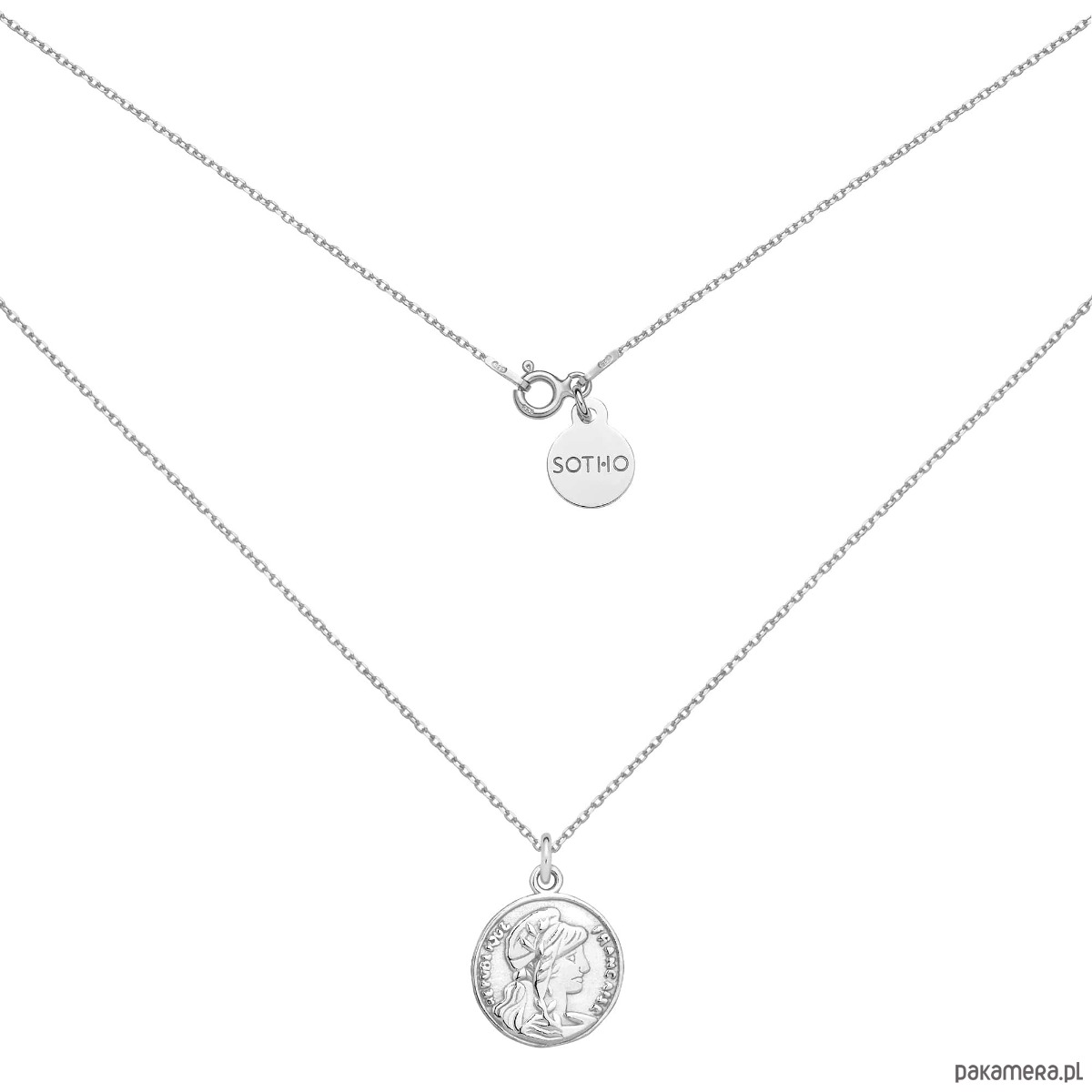 Srebrny naszyjnik ze starą monetą i zawieszką z logo marki. Całość wykonana ze srebra 925.