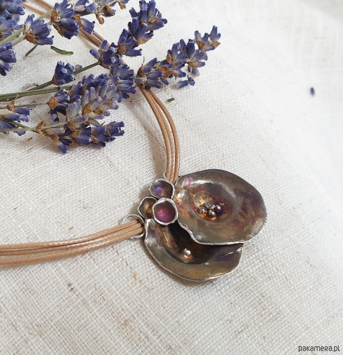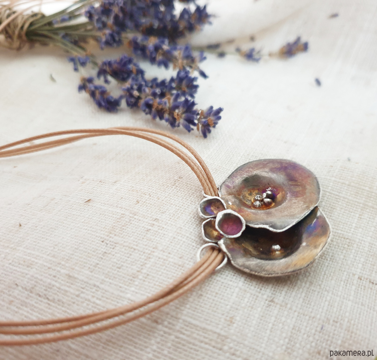 Powierzchnia została oksydowana, dzięki czemu srebro mieni się subtelnymi refleksami złota, srebra i fioletu.