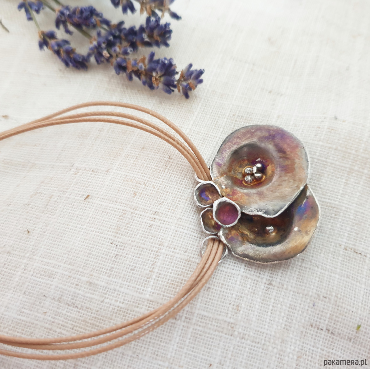 Zawieszka została umieszczona na trzech jubilerskich sznurkach, które podkreślają jej nowoczesny, artystyczny charakter i nadają kompozycji lekkości.