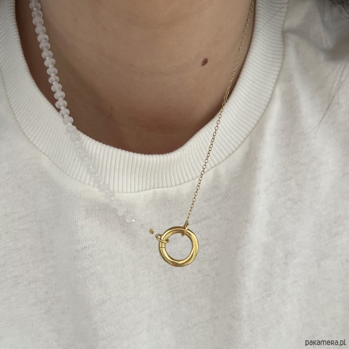 Głównym elementem kompozycji są naturalne jadeity w odcieniu kokosowym – subtelne, kremowe kamienie o delikatnym połysku. Ich naturalna faktura i kolor sprawiają, że naszyjnik doskonale komponuje się z codziennymi i eleganckimi stylizacjami.