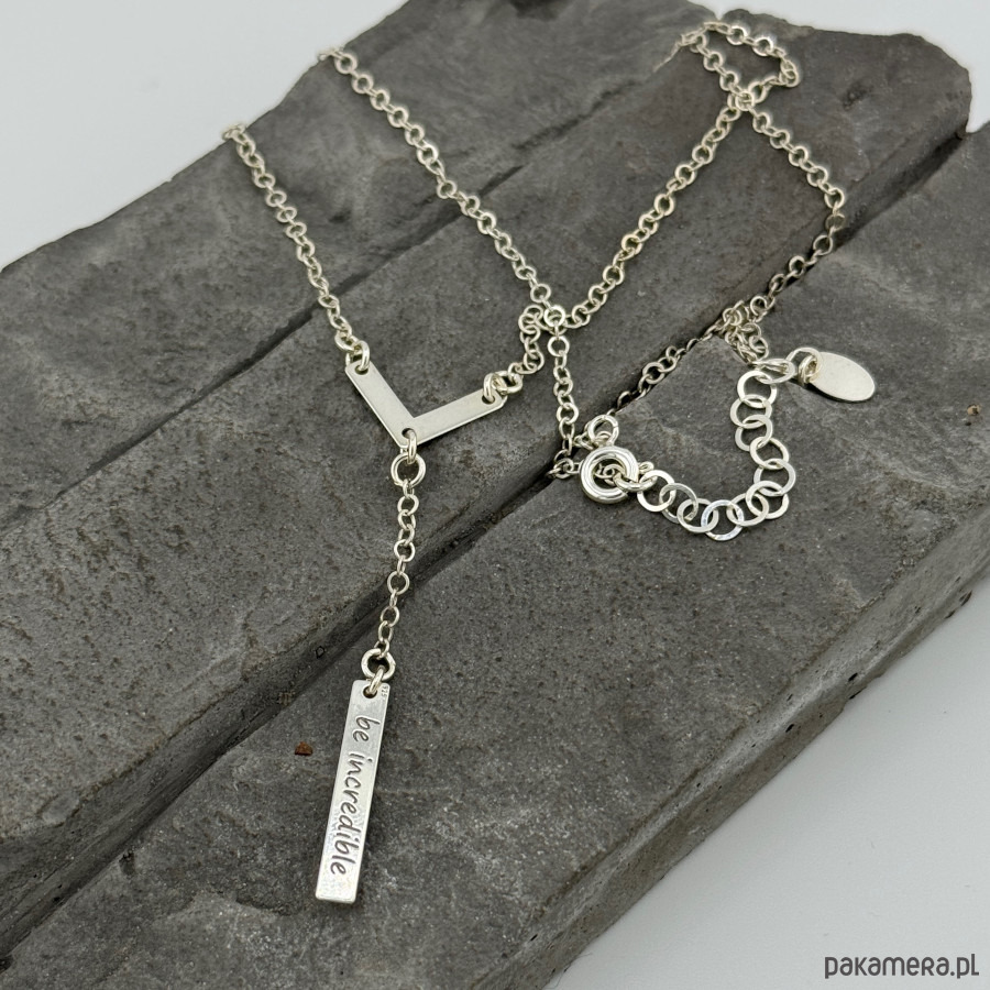 Delikatny i elegancki naszyjnik wykonany w całości ze srebra próby 925 z zawieszka z wygrawerowanym napisem 'be incedible'. Grubość łańcuszka to 2 mm. Całkowita długość naszyjnika to 47 mm plus regulacja 5 cm, wisiorek ma długość ok. 5 cm. Jeden z dwóch egzemplarzy. Ozdobnie zapakowany.
