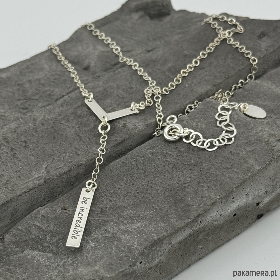 Delikatny i elegancki naszyjnik wykonany w całości ze srebra próby 925 z zawieszka z wygrawerowanym napisem 'be incedible'. Grubość łańcuszka to 2 mm. Całkowita długość naszyjnika to 47 mm plus regulacja 5 cm, wisiorek ma długość ok. 5 cm. Jeden z dwóch egzemplarzy. Ozdobnie zapakowany.