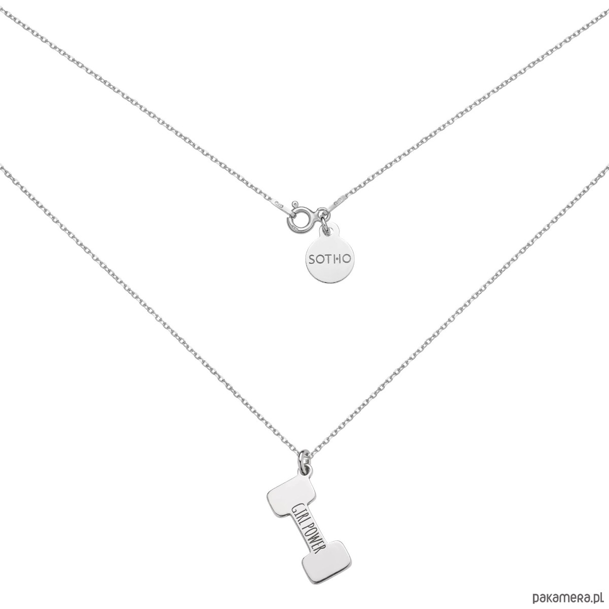 Srebrny naszyjnik łańcuszkowy zdobiony ciężarkiem i zawieszką z logo marki. Całość wykonana ze srebra 925.