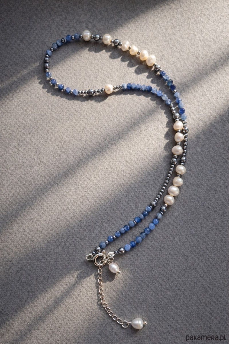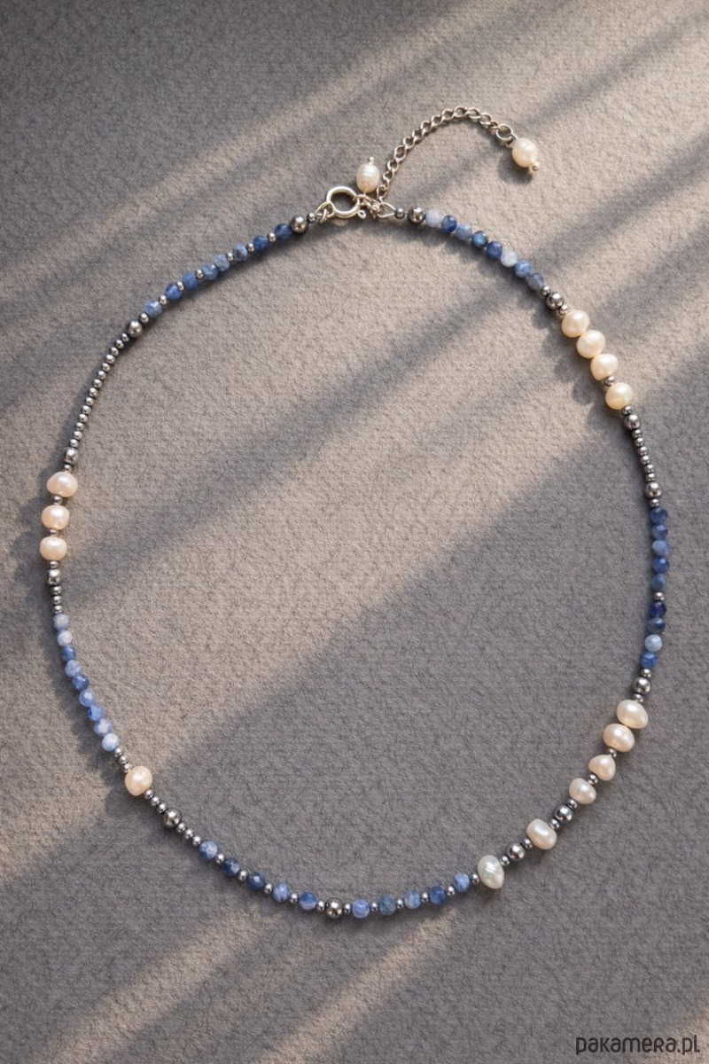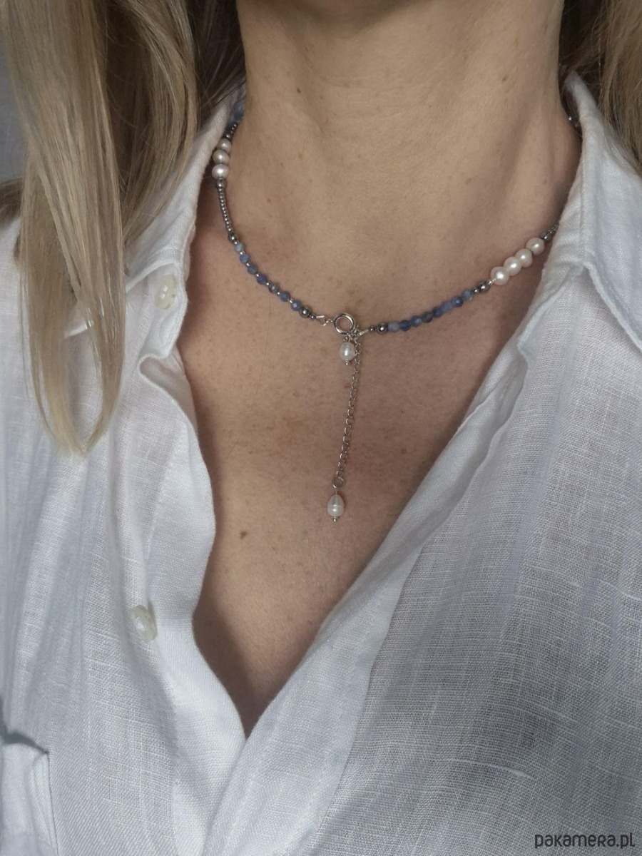 Naszyjnik Cool Blue to ręcznie wykonana biżuteria inspirowana chłodną elegancją błękitu, srebra i perłowej bieli. Powstał z połączenia naturalnych niebieskich szafirów oraz subtelnych pereł, które zostały rytmicznie przetykane srebrzystymi hematytami, nadając całości nowoczesny, lekko minimalistyczny charakter.