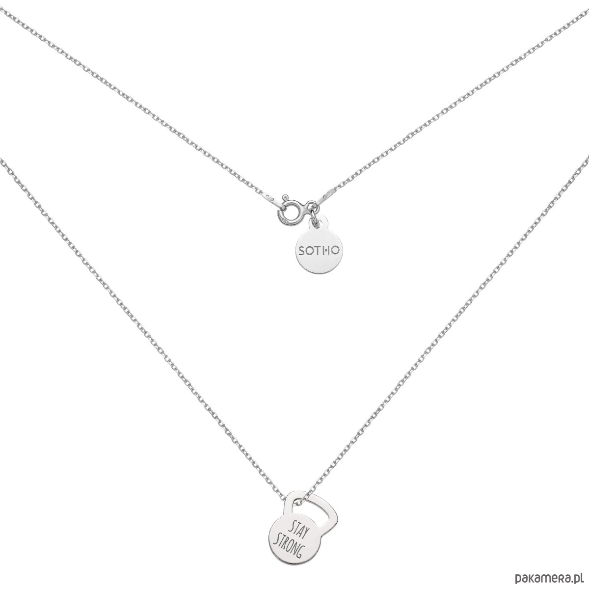Srebrny naszyjnik łańcuszkowy zdobiony ciężarkiem kettlebellem i zawieszką z logo marki. Całość wykonana ze srebra 925.