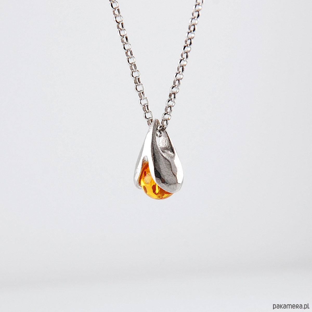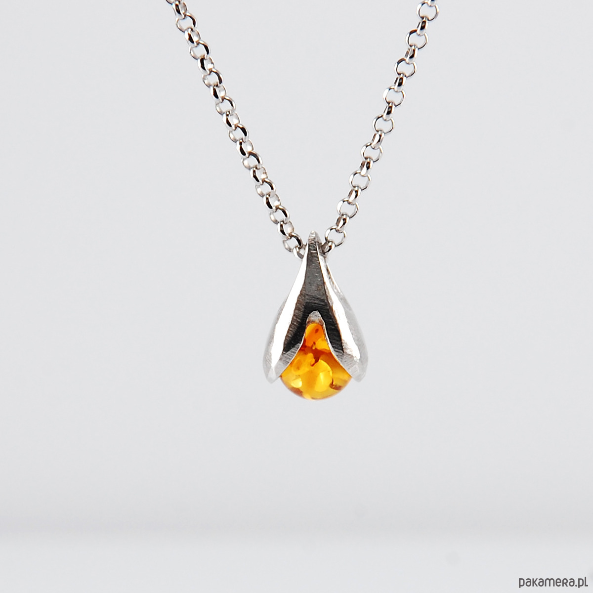 Wymiary kropli 7x12mm, średnica bursztynu 6mm, długość całkowita łańcuszka 45, 55 lub 65 cm