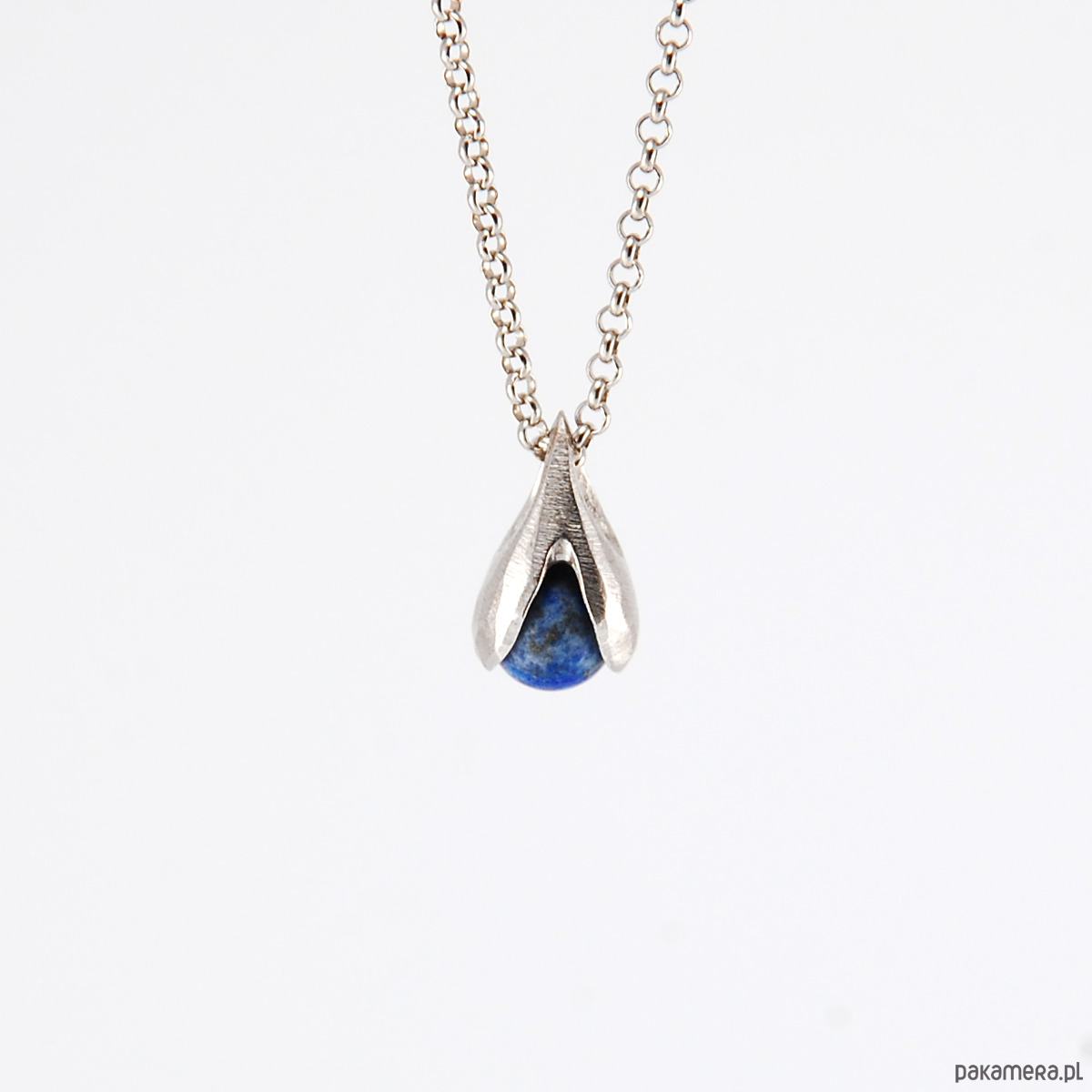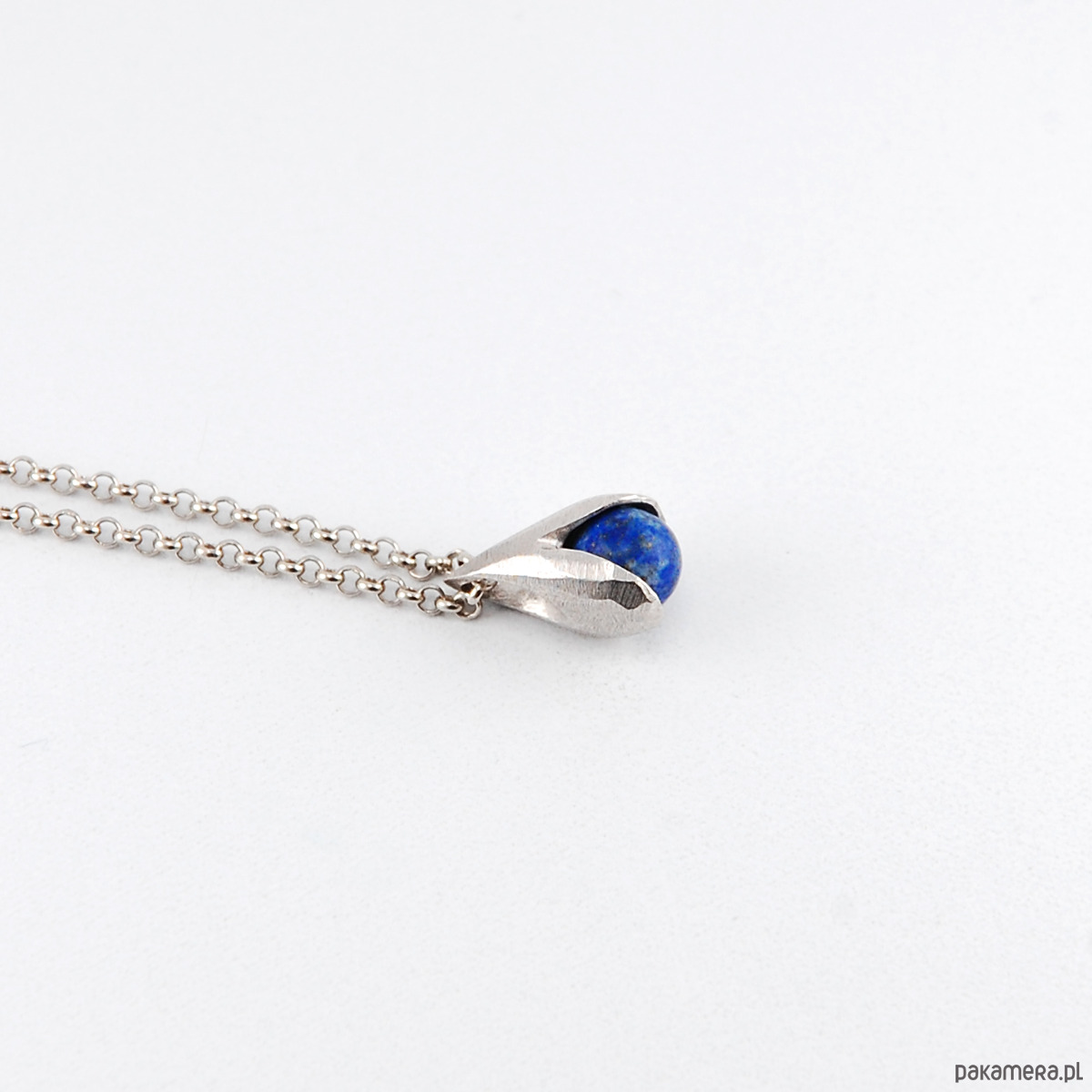 Naszyjnik KONWALIA jest wykonany ze srebra próby 925 w matowym fasetowanym wykończeniu oraz matowej kulki lapis lazuli. Pokryty jest szlachetnym rodem, dzięki czemu srebro nie ciemnieje.