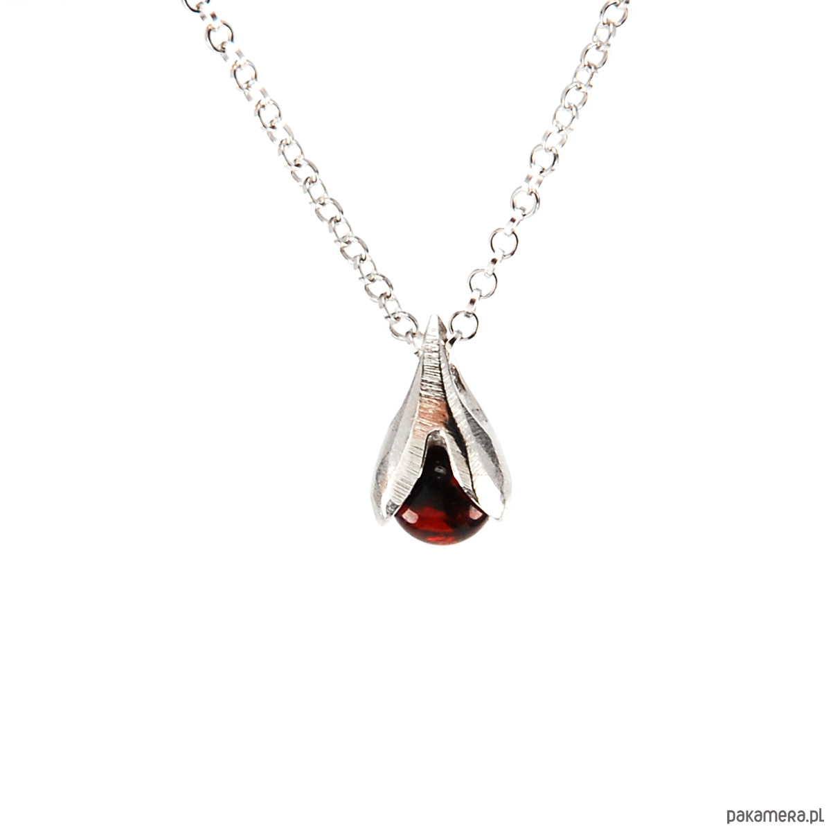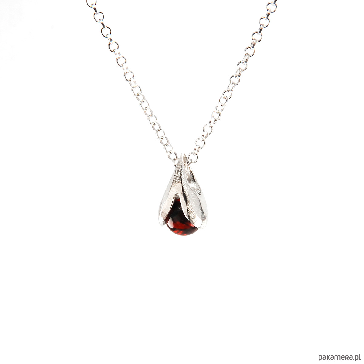 Naszyjnik Konwalia to eleganckie połącznie bursztynu bałtyckiego o wiśniowej barwie oraz srebra próby 925 w matowym fasetowanym wykończeniu. Pokryty jest szlachetnym rodem, dzięki czemu srebro nie ciemnieje.