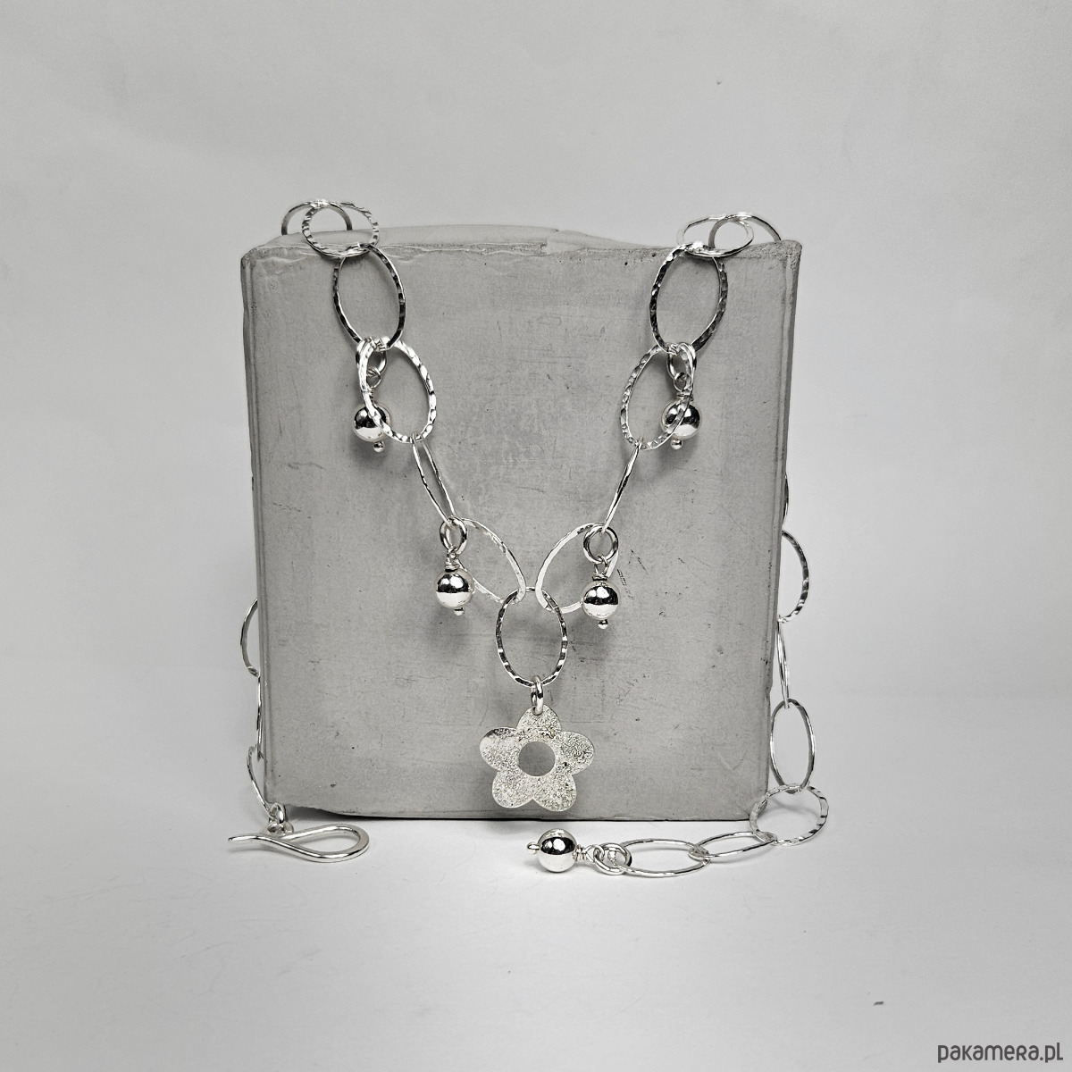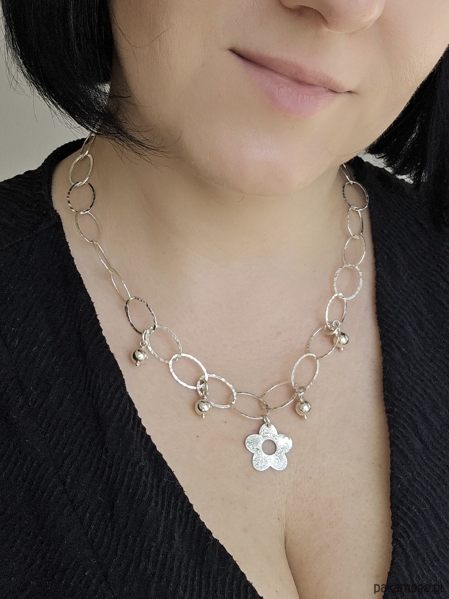 Naszyjnik ażurowy z kwiatem niezapominajką i kulkami.