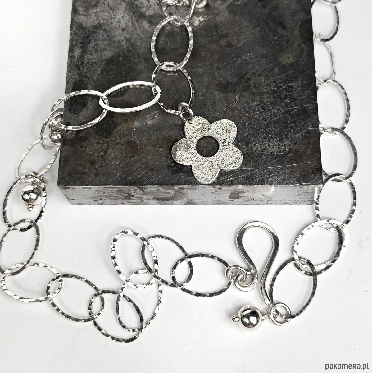Ręcznie wykonaną niezapominajkę przyczepiłam do pięknego młotkowanego dużego łańcucha. Dodatkowymi ozdobami są kulki oraz ręcznie wykonany haczyk jako zapięcie.