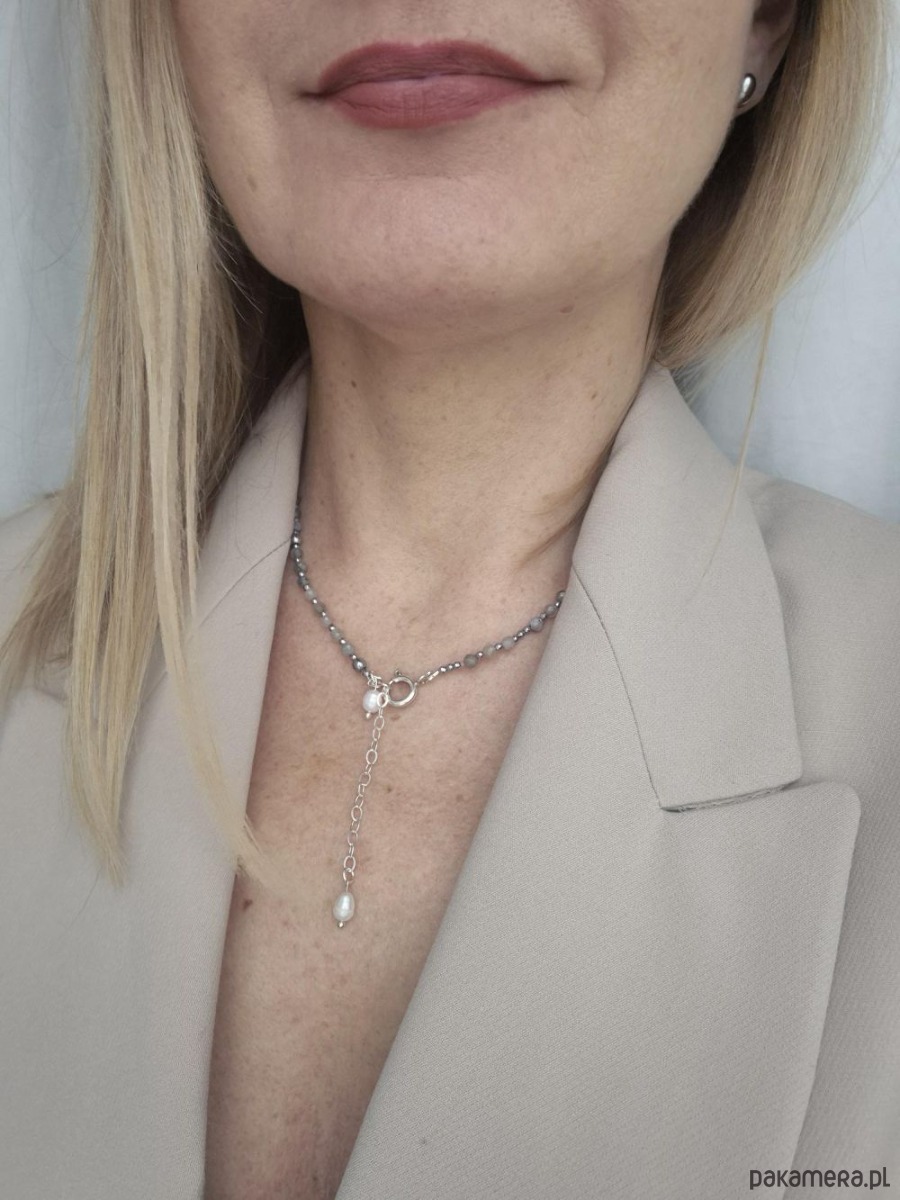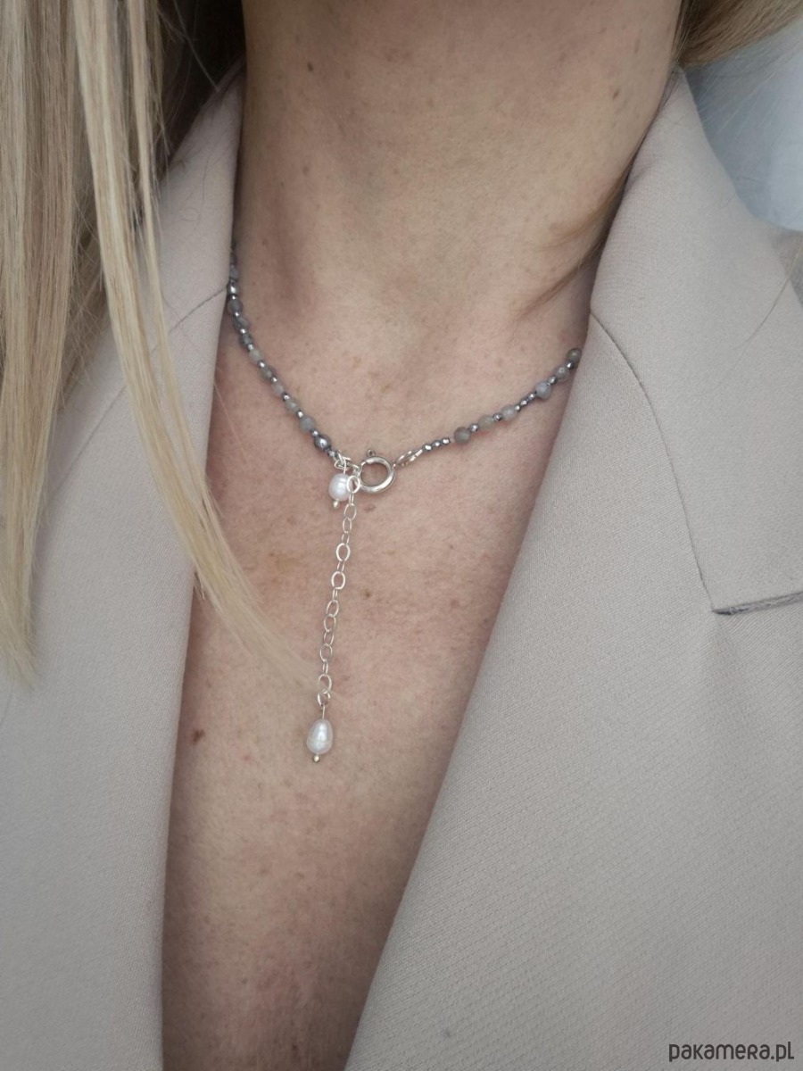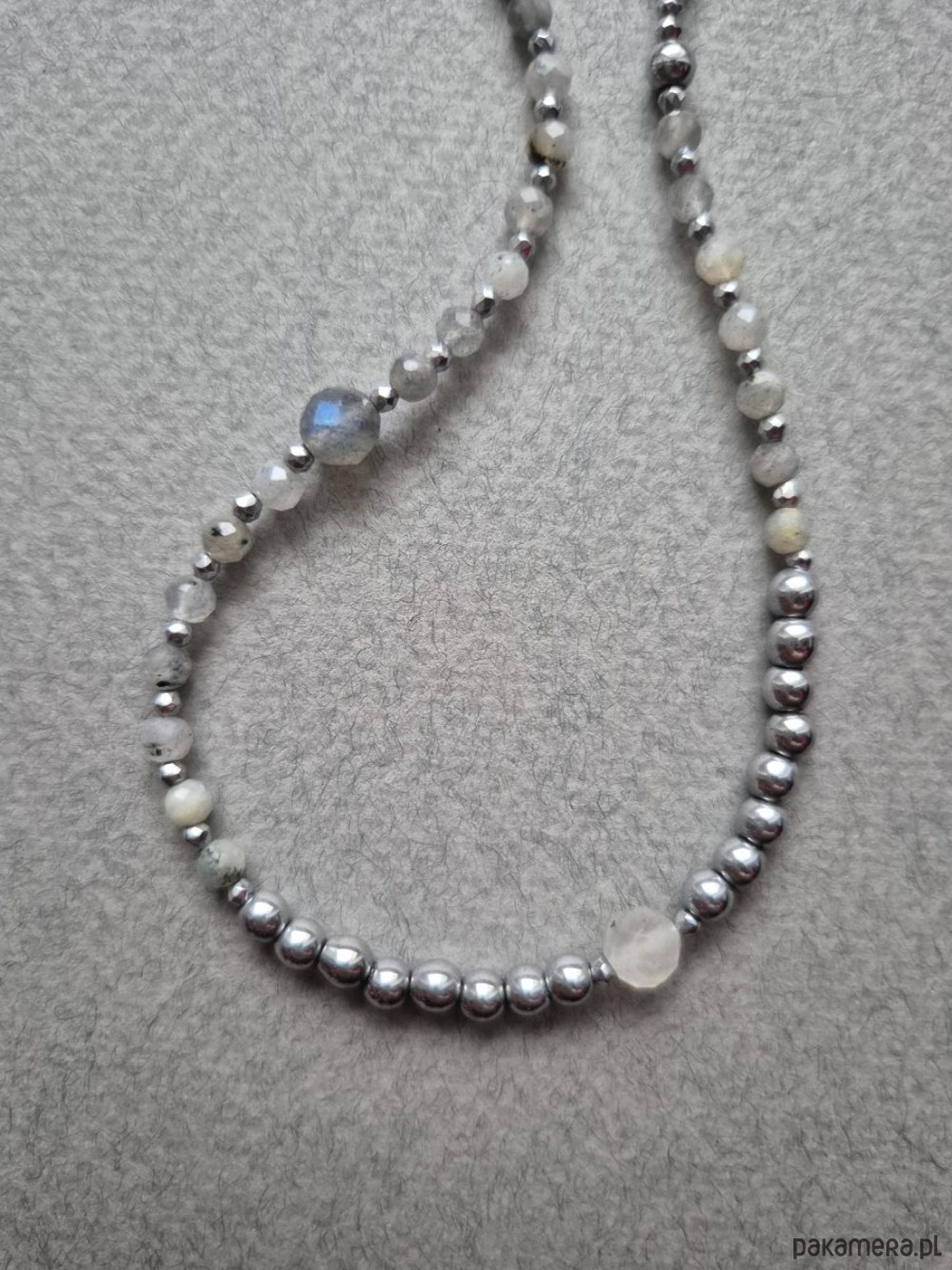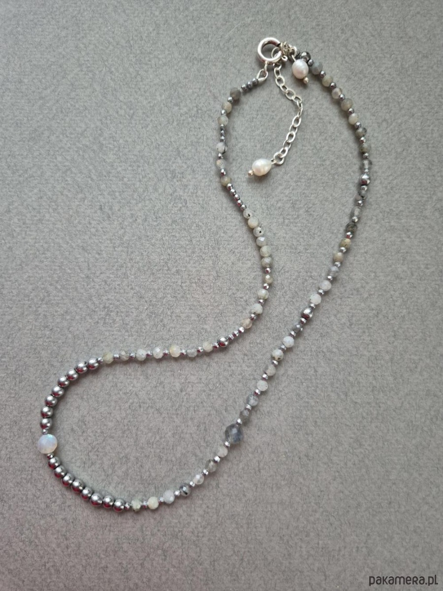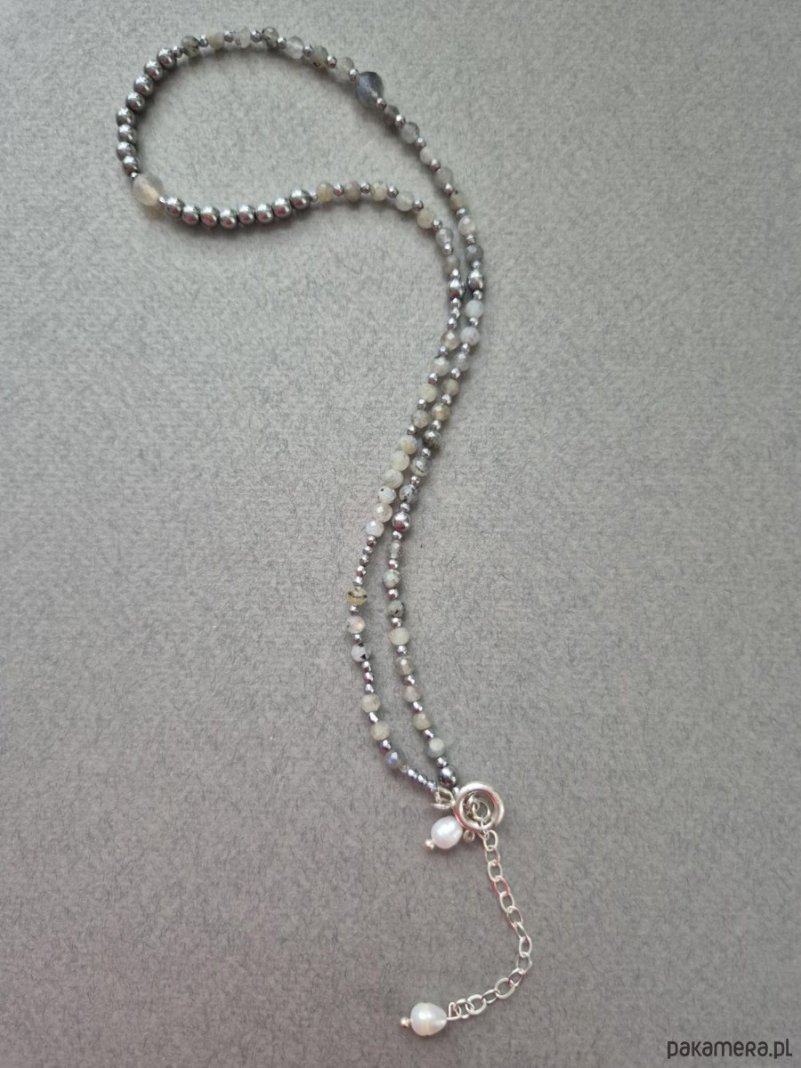 Naszyjnik wykonany ręcznie z naturalnych labradorytów, pereł i srebrnych hematytów inspirowana chłodną elegancją srebra i perłowej bieli. Powstał z połączenia naturalnych labradorytów, które zostały przetykane srebrzystymi hematytami, nadając całości nowoczesny, lekko minimalistyczny charakter. Naszyjnik zyskuje dzięki bliższemu poznaniu i niebieskim ognikom labradorytów.