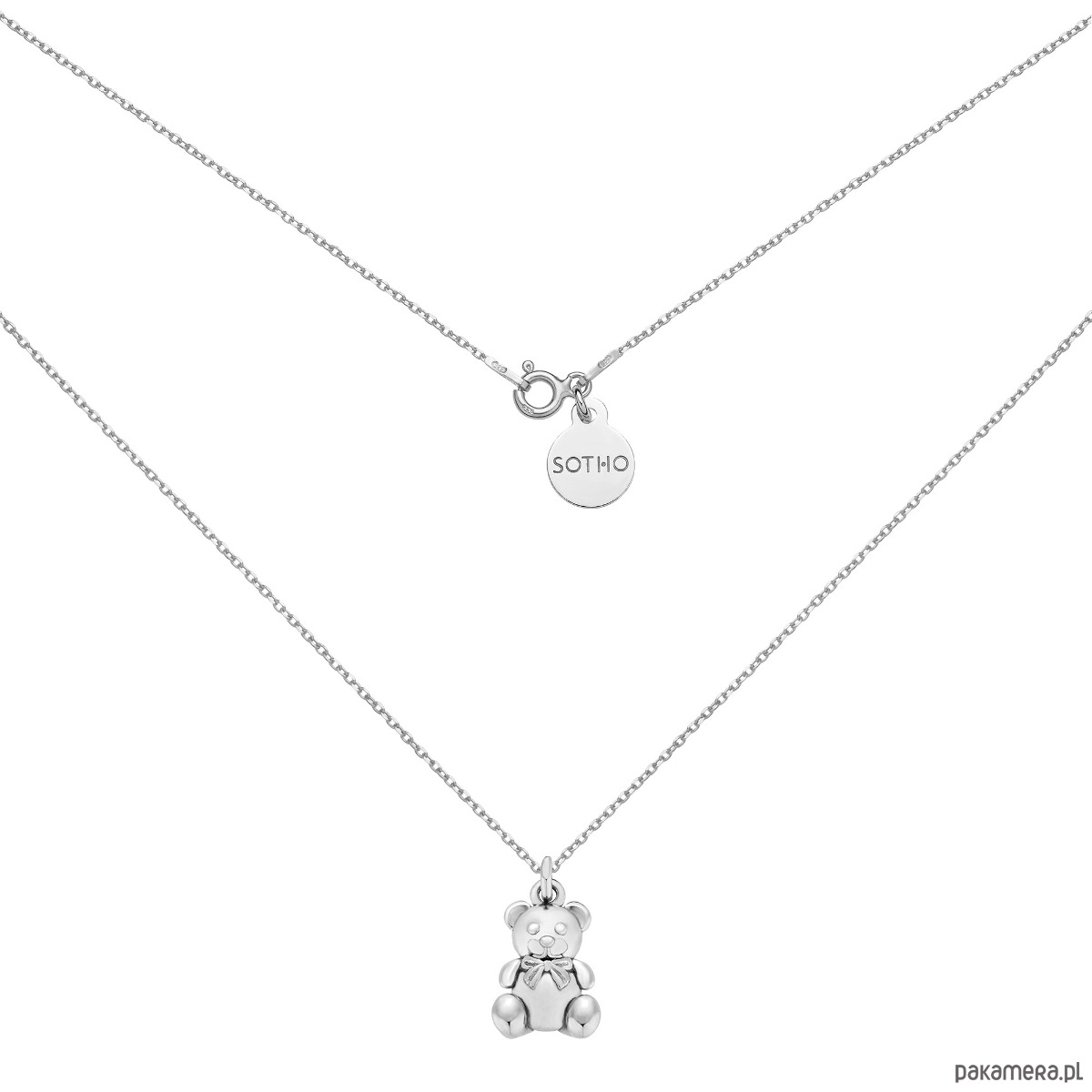 Srebrny naszyjnik z misiem ozdobionym kokardką oraz zawieszką z logo marki. Całość wykonana ze srebra 925.