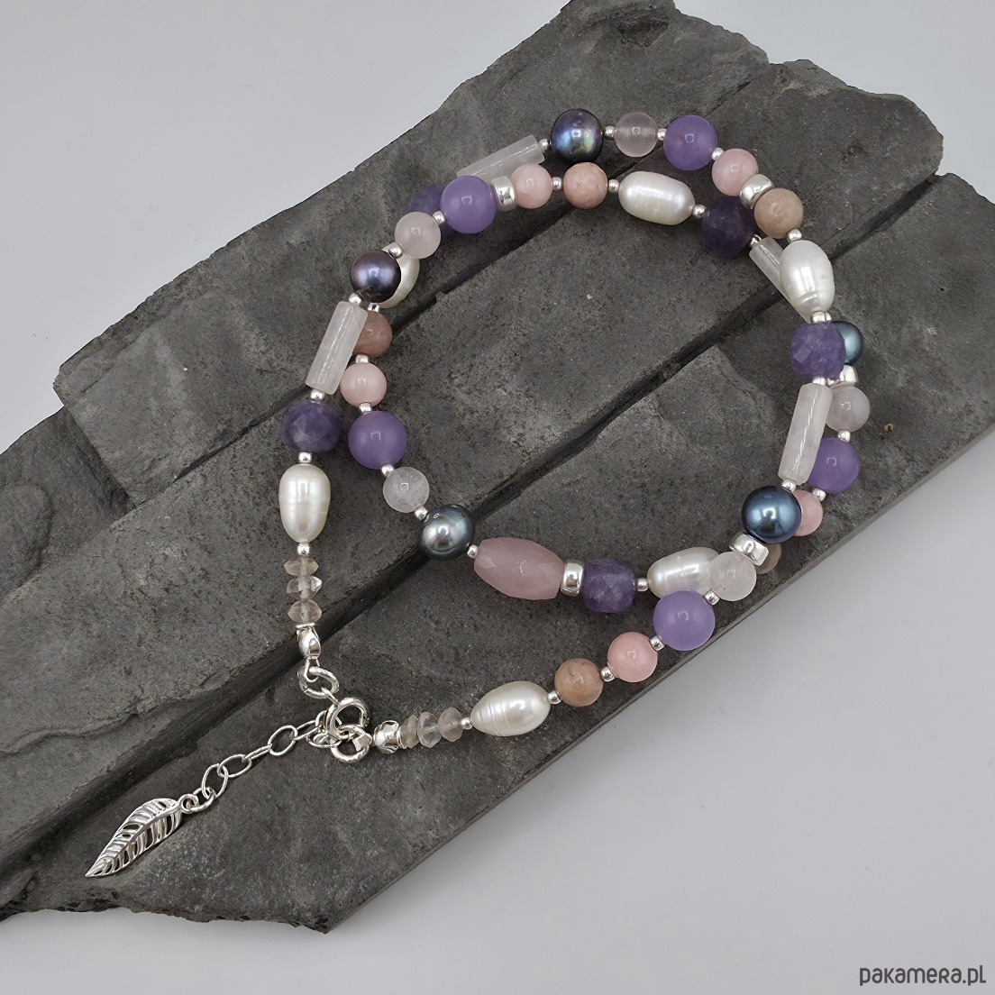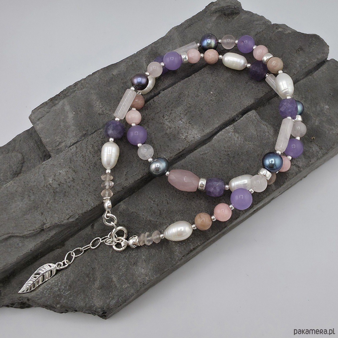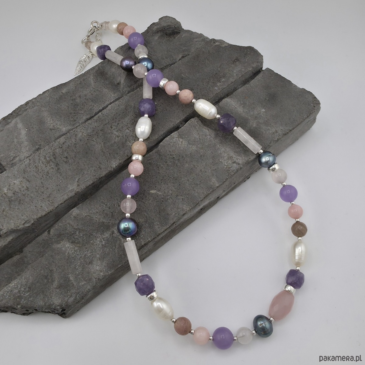 Kobiecy, elegancki, unikatowy naszyjnik. Wykonany w całości ze srebra próby 925 oraz kamieni: ametyst, perła, jadeit, rodonit, kwarc. Średnica kamieni to 4-9 mm. Całkowita długość naszyjnika regulowana w zakresie 46 - 49 cm. Na życzenie mogę go zoksydować lub wykonać z innymi kamieniami. Przedłużkę zakończoną lustkiem mozna nosić z tyłu lub z przodu jako wisiorek. Ozdobnie zapakowany.