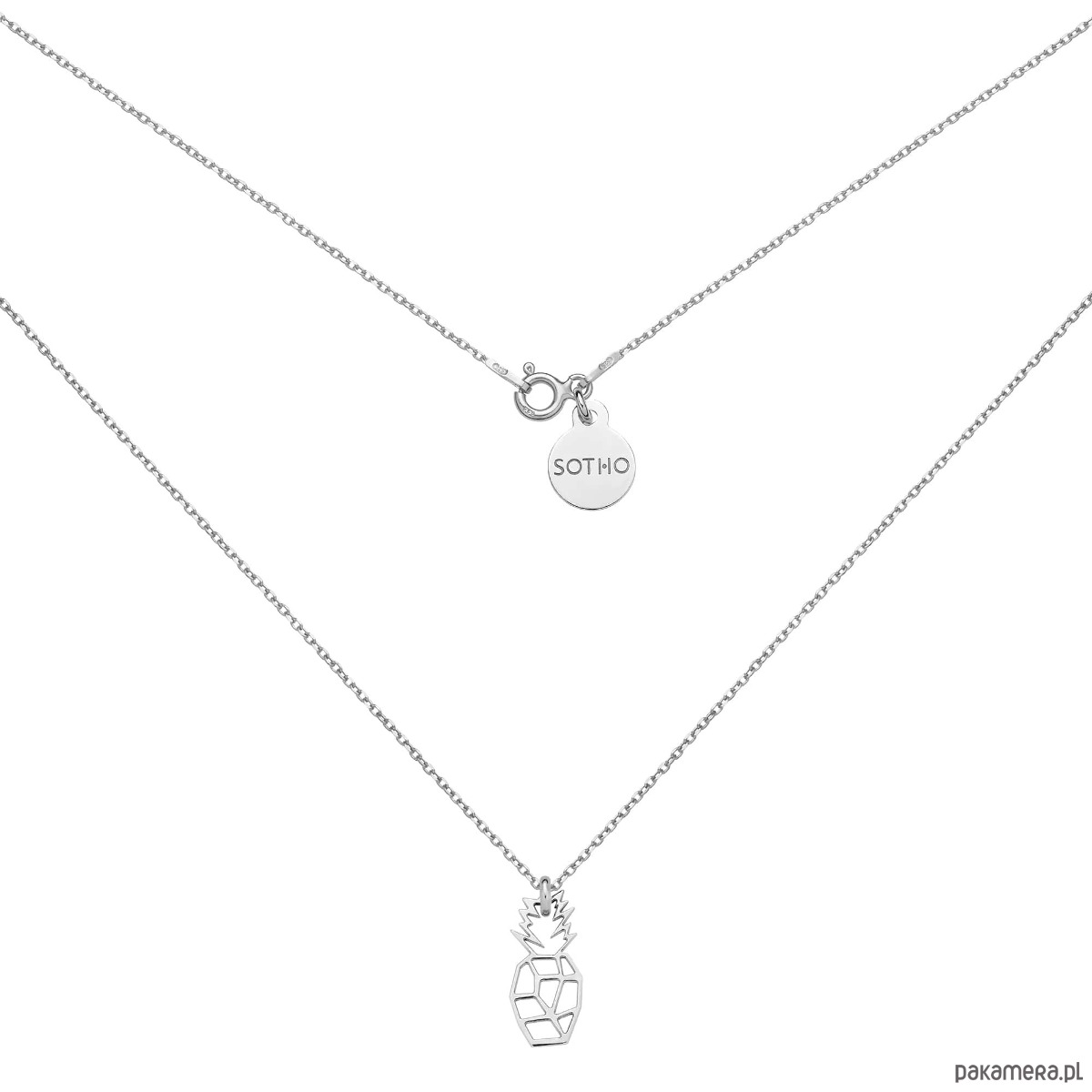 Srebrny naszyjnik łańcuszkowy zdobiony ażurowym ananasem i zawieszką z logo marki. Całość wykonana ze srebra 925.