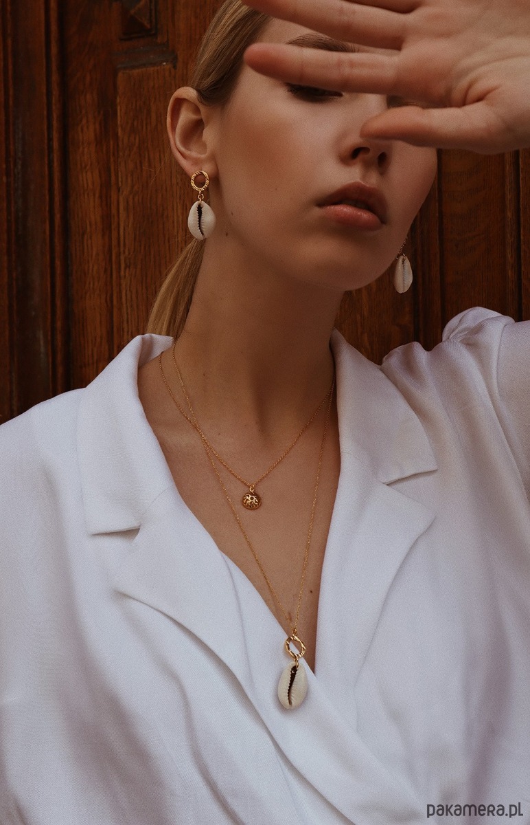 Srebrny naszyjnik łańcuszkowy zdobiony chropowatym kółeczkiem i muszelką oraz zawieszką z logo marki. Całość wykonana ze srebra 925.