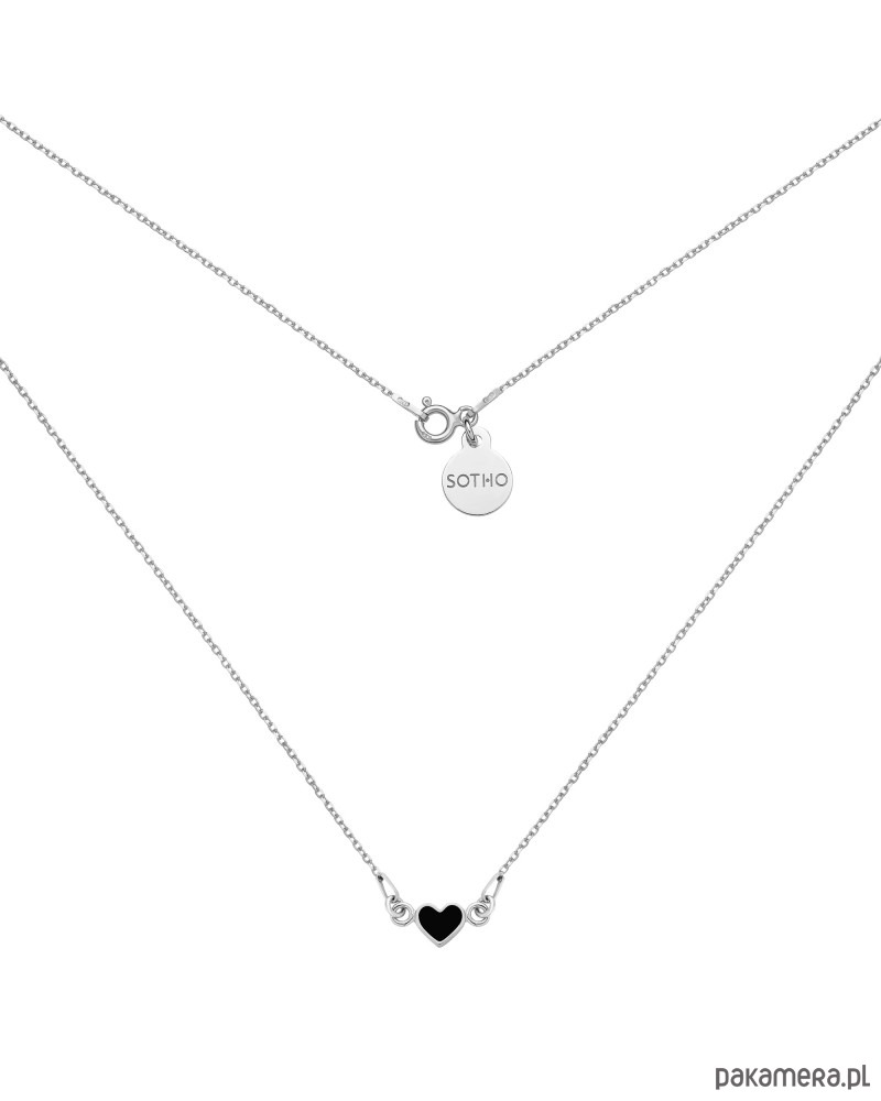 Srebrny naszyjnik z czarnym serduszkiem i zawieszką z logo marki. Całość wykonana ze srebra 925.
