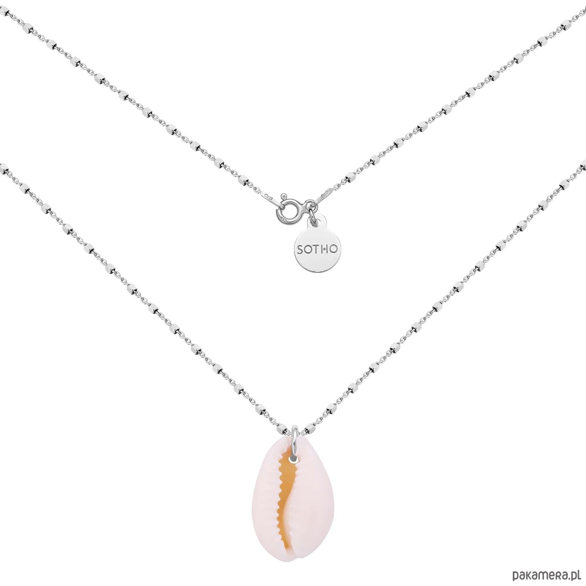 Srebrny naszyjnik kosteczkowy zdobiony muszelką i zawieszką z logo marki. Całość wykonana ze srebra 925.