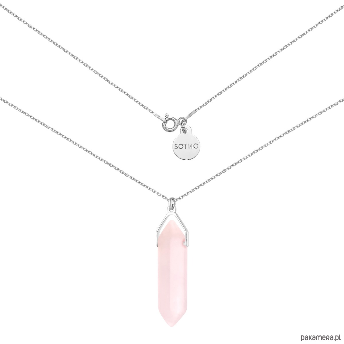 Srebrny naszyjnik zdobiony dużym kwarcem różowym i zawieszką z logo marki. Całość wykonana ze srebra 925.