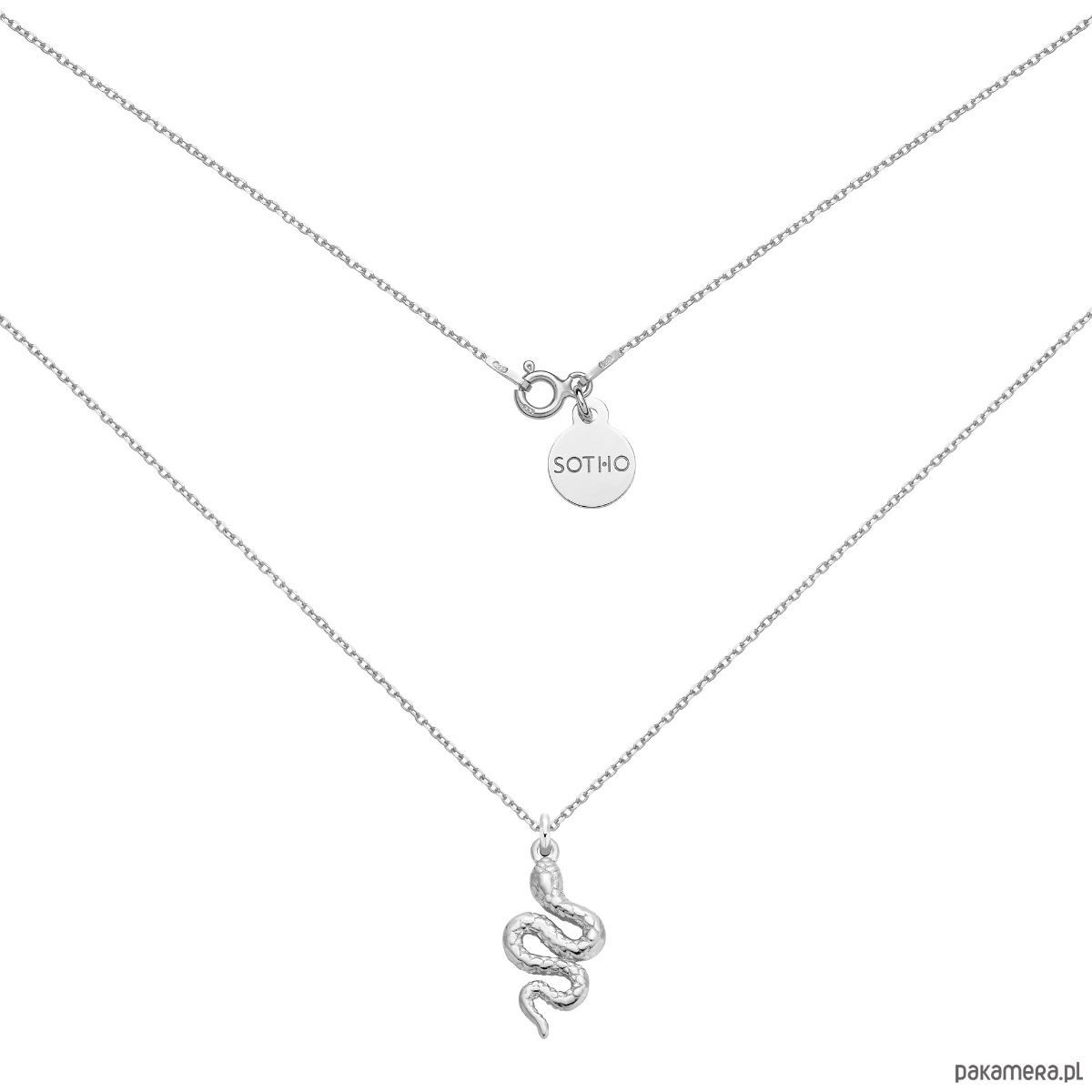 Srebrny naszyjnik z wężem i zawieszką z logo marki. Całość wykonana ze srebra 925.