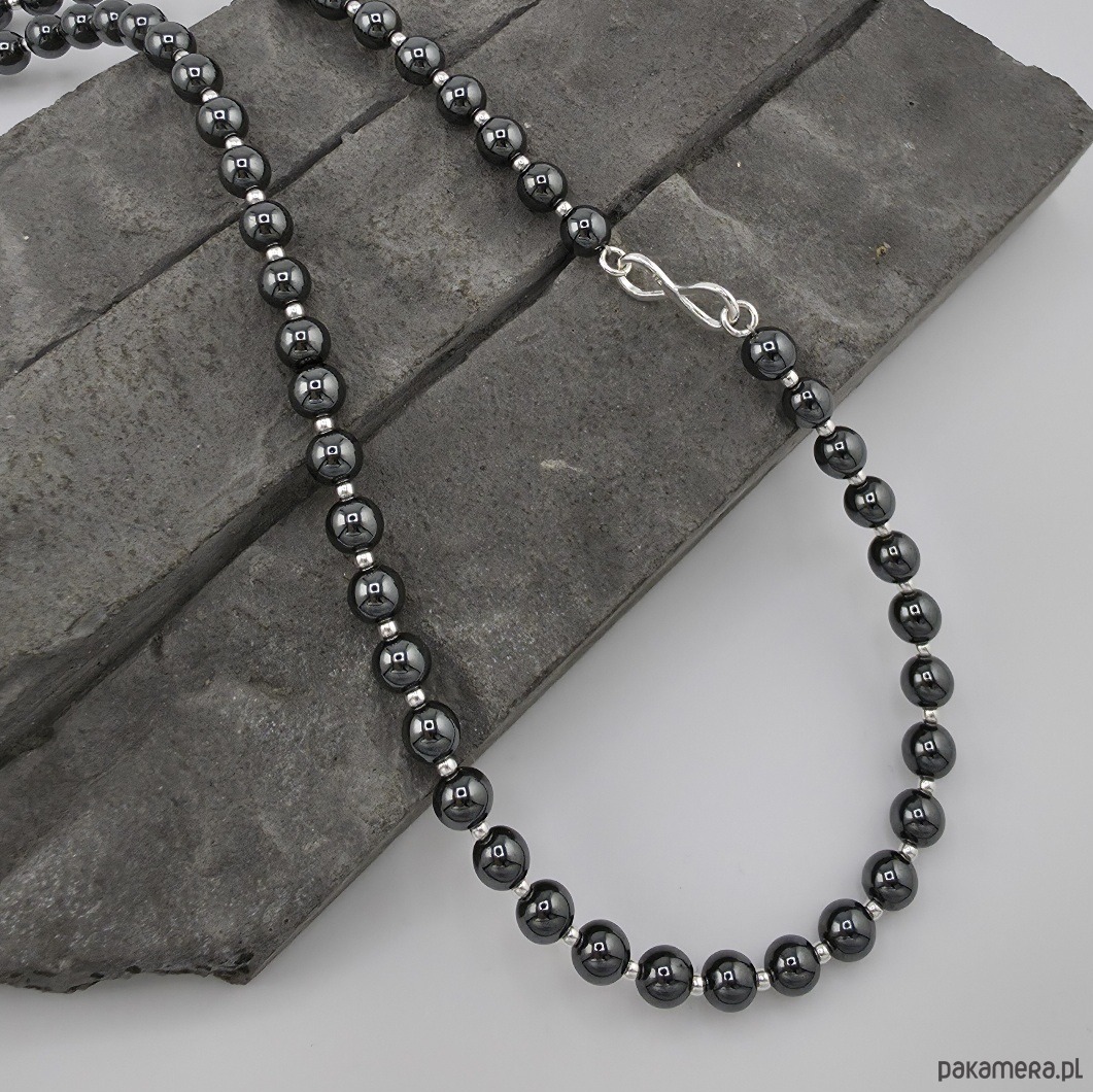 Prosty, minimalistyczny naszyjnik na co dzień i nie tylko. Wykonany w całości ze srebra próby 925 oraz kulek hematytu wielkości 0,6 cm. Asymetrycznie na obwodzie zostal umieszczony znak nieskończoności. Obwód naszyjnika to 53,5 cm plus 5 cm regulacji. Na życzenie mogę obwód zmienić lub wykonac z innymi kamieniami. Ozdobnie zapakowany.