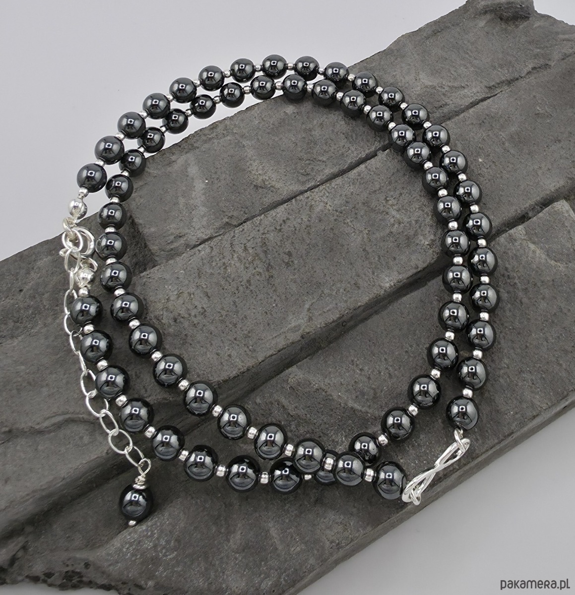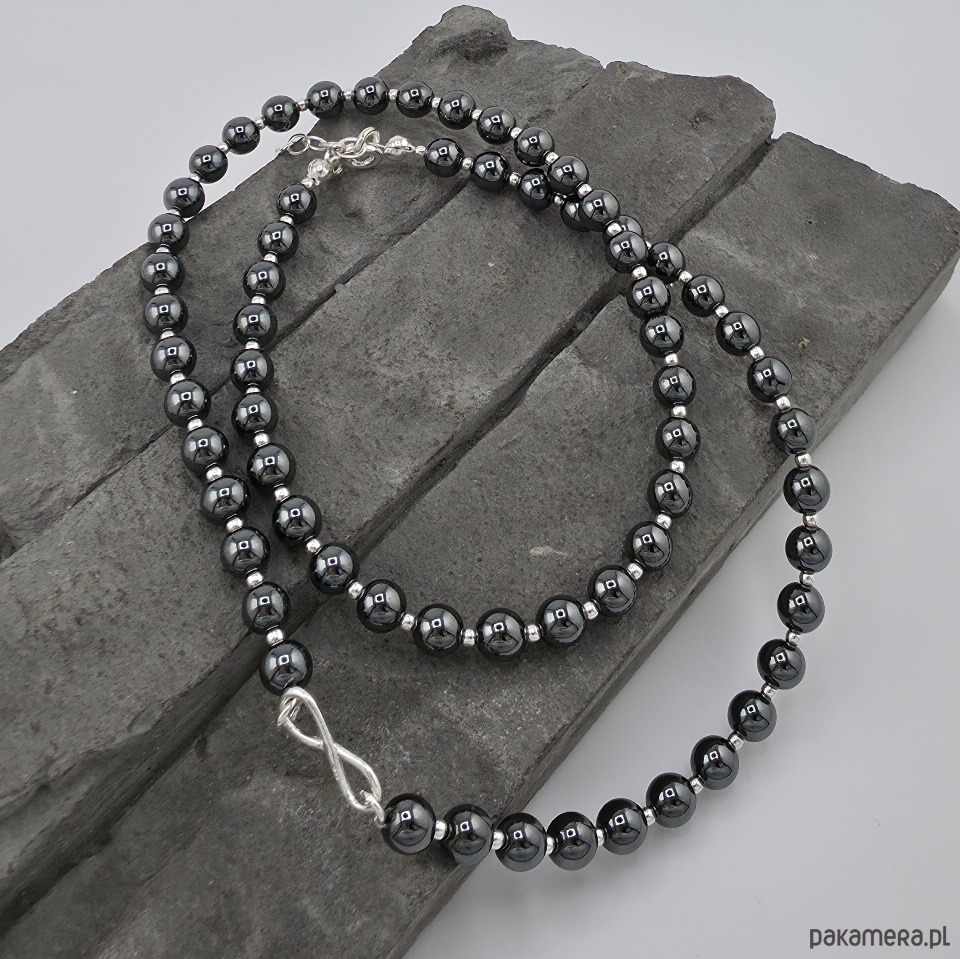 Prosty, minimalistyczny naszyjnik na co dzień i nie tylko. Wykonany w całości ze srebra próby 925 oraz kulek hematytu wielkości 0,6 cm. Asymetrycznie na obwodzie zostal umieszczony znak nieskończoności. Obwód naszyjnika to 53,5 cm plus 5 cm regulacji. Na życzenie mogę obwód zmienić lub wykonac z innymi kamieniami. Ozdobnie zapakowany.