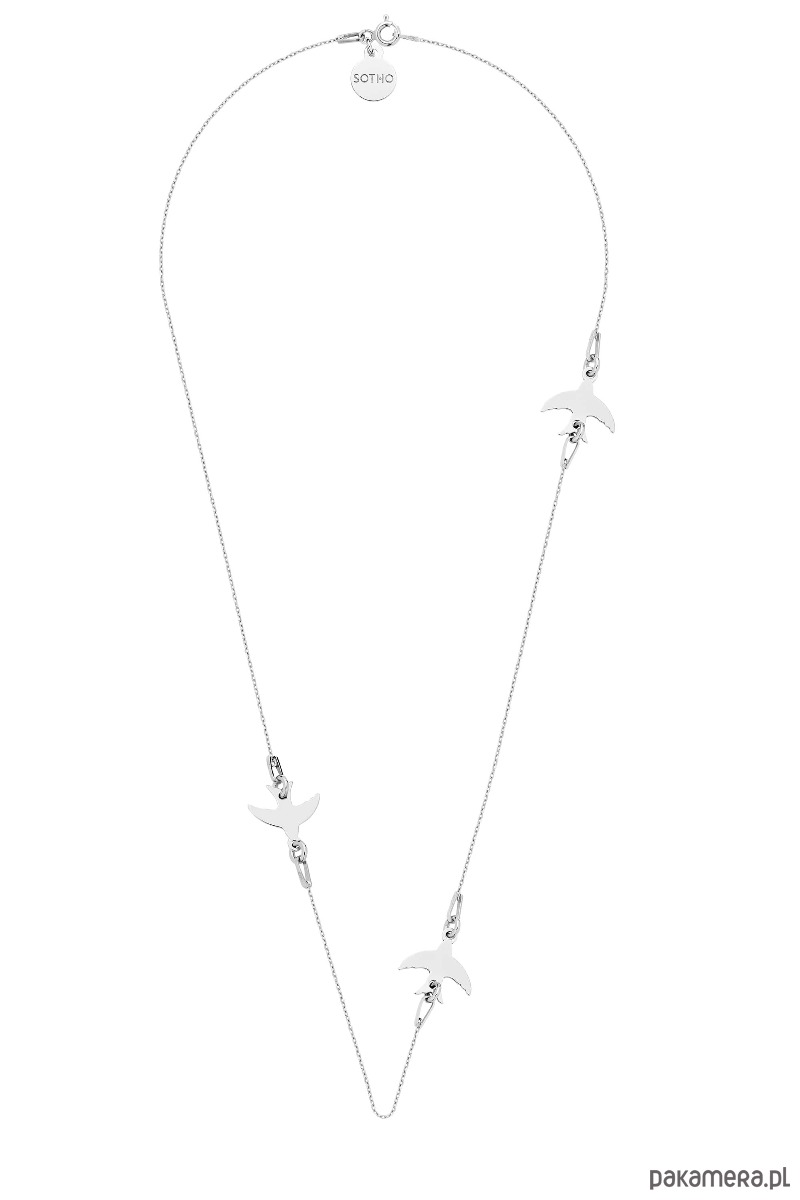 Srebrny naszyjnik łańcuszkowy z jaskółkami i zawieszką z logo marki. Całość wykonana ze srebra 925.