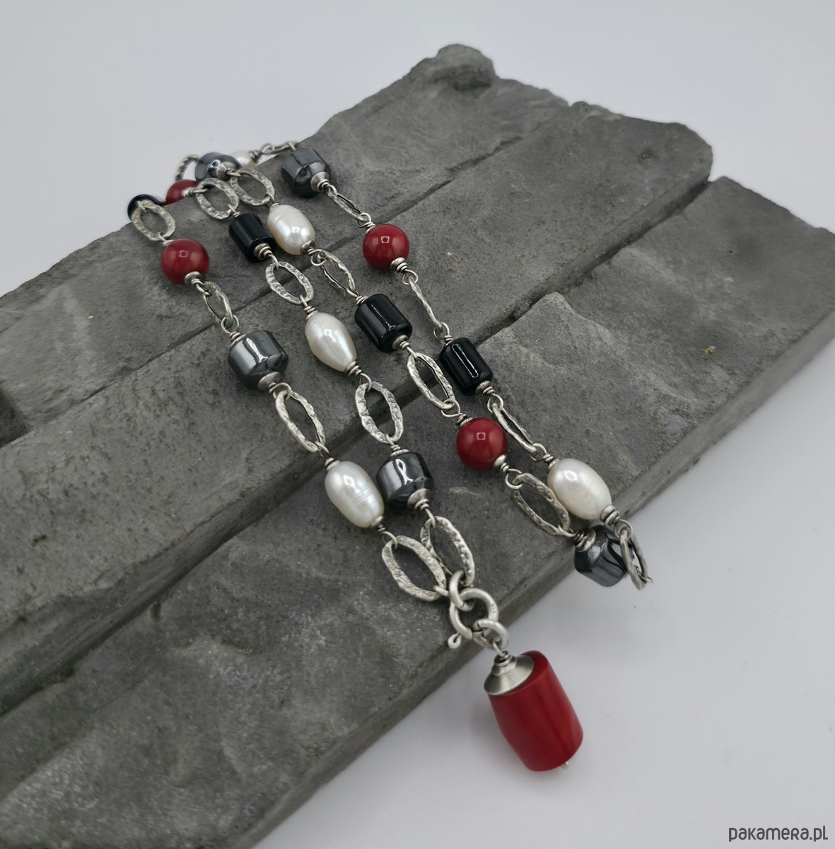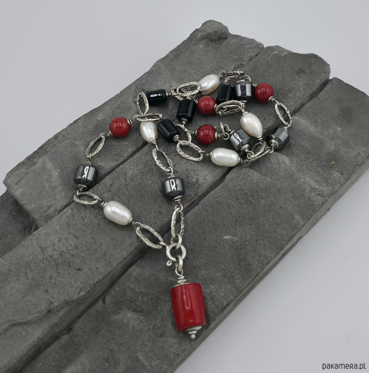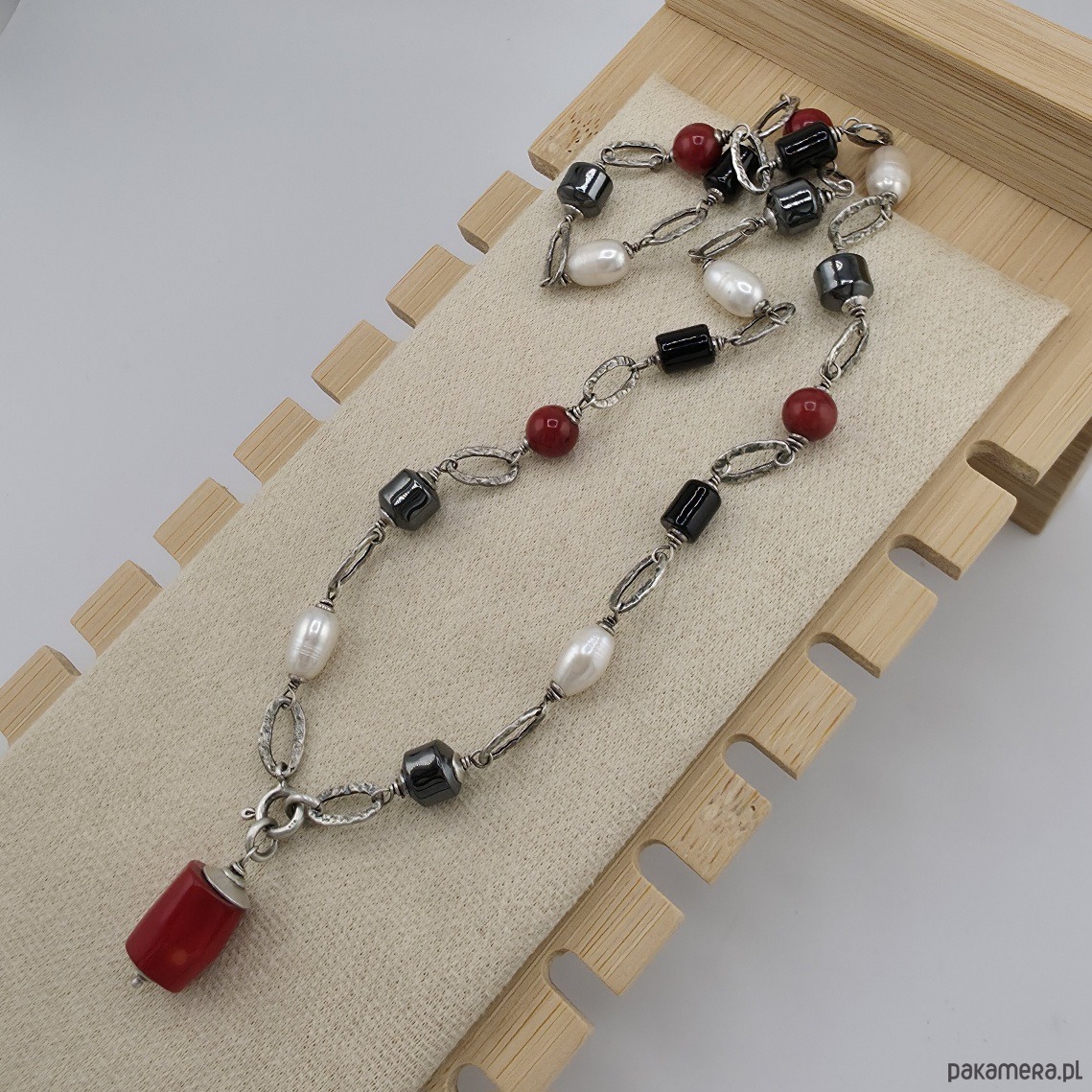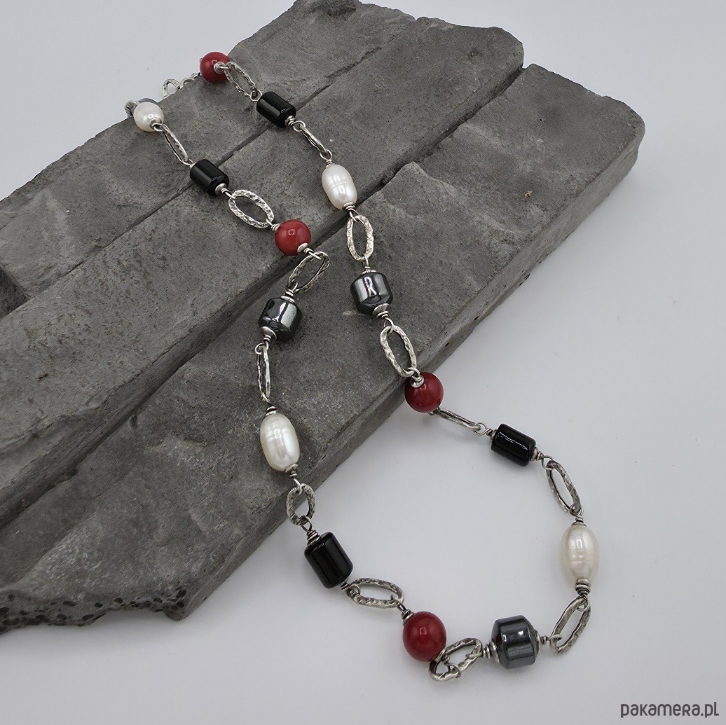 Modny, masywniejszy naszyjnik na co dzień i nie tylko. Wykonany w całości z oksydowanego srebra próby 925 oraz kamieni onyksu, czerwonego korala i pereł słodkowodnych wielkosci 8-10 mm. Dodatkowo posiada zawieszkę z czerwonym koralem wielkosci 14x9mm, którą można ściągnąć z zapiecia i naszyjnik nosić bez niej albo na dodatkowym łańcuszku. Wielkość ogniw łańcucha to 11x5,5 mm. Zawieszkę mogę wykonać również z innym kamieniem. Obwód naszyjnika to 49,5 cm. Ozdobnie zapakowany.