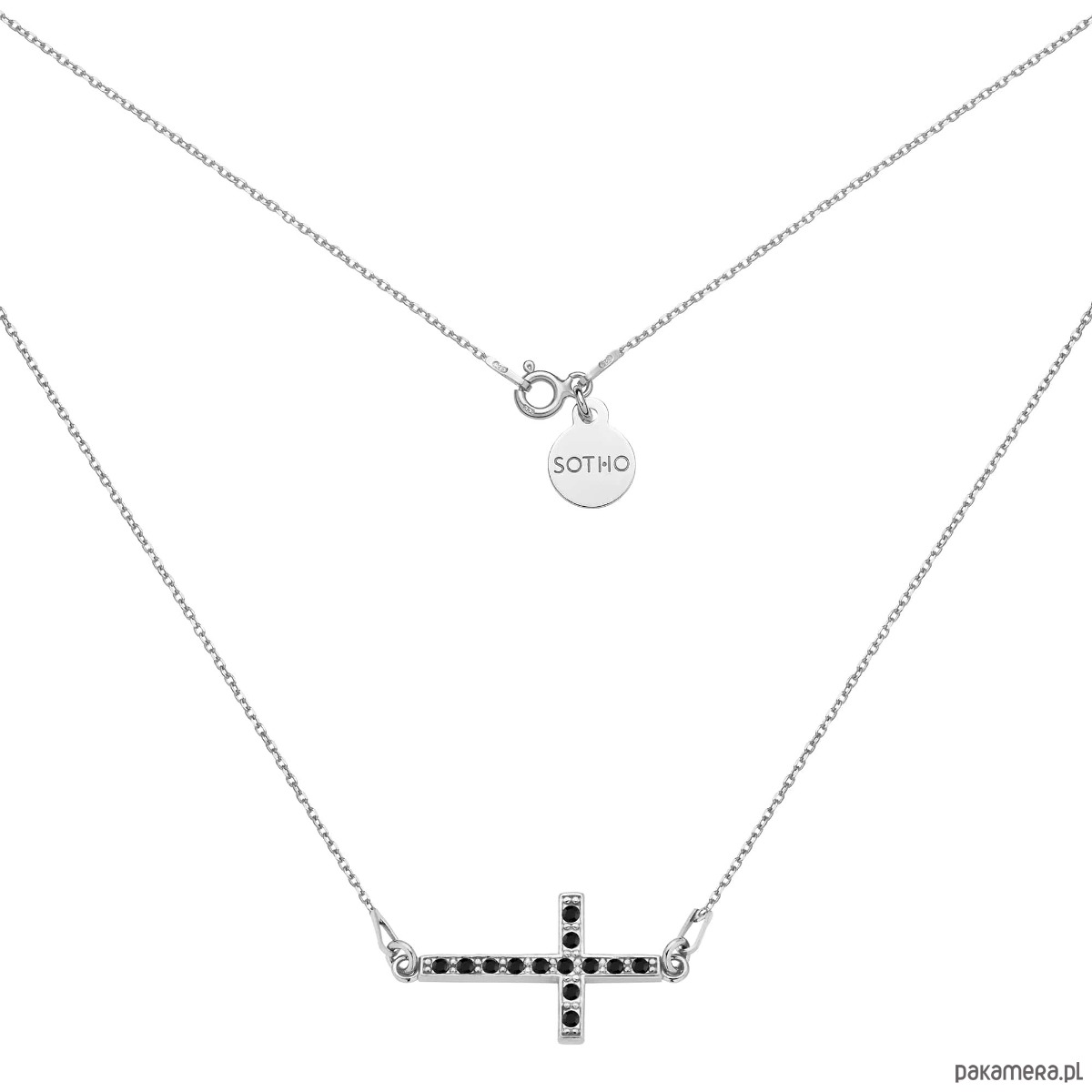 Srebrny naszyjnik łańcuszkowy zdobiony krzyżem wysadzanym czarnymi kryształami SWAROVSKI® CRYSTAL w kolorze Jet i zawieszką z logo marki. Całość wykonana ze srebra 925.