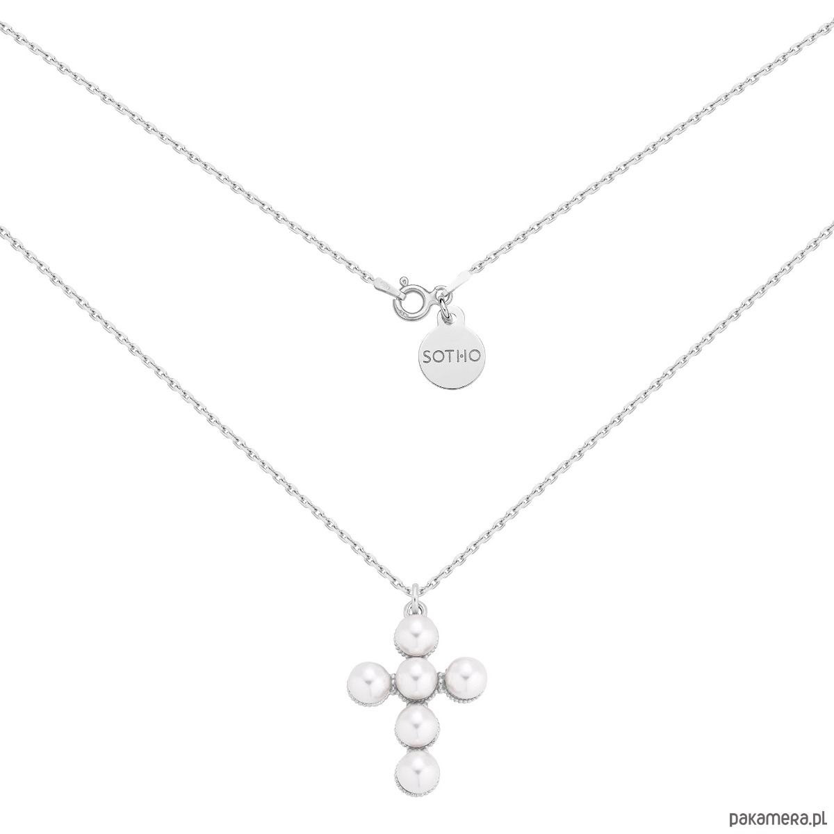 Srebrny naszyjnik z krzyżem zdobionym perłami SWAROVSKI® CRYSTAL w kolorze białym White i zawieszką z logo marki. Całość wykonana ze srebra 925.