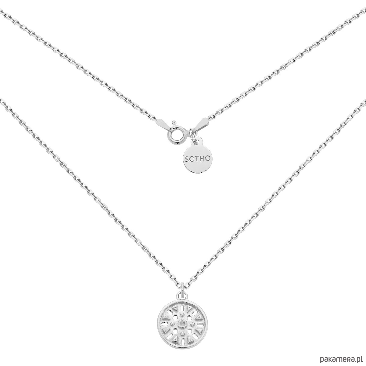 Srebrny łańcuszek z medalionem oraz zawieszką z logo marki.