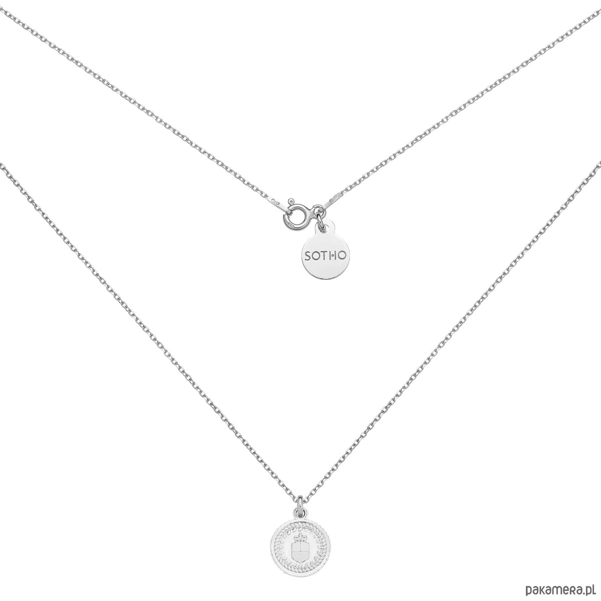 Srebrny naszyjnik łańcuszkowy z medalionem i zawieszką z logo marki. Całość wykonana ze srebra 925.