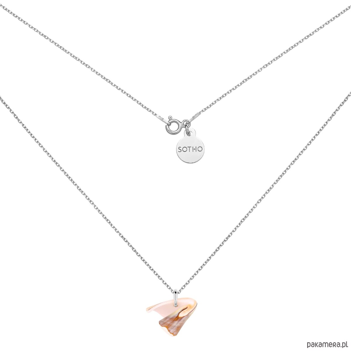 Srebrny naszyjnik łańcuszkowy z muszelką i zawieszką z logo marki. Każdy egzemplarz posiada unikatową, niepowtarzalną muszelkę. Całość wykonana ze srebra 925.