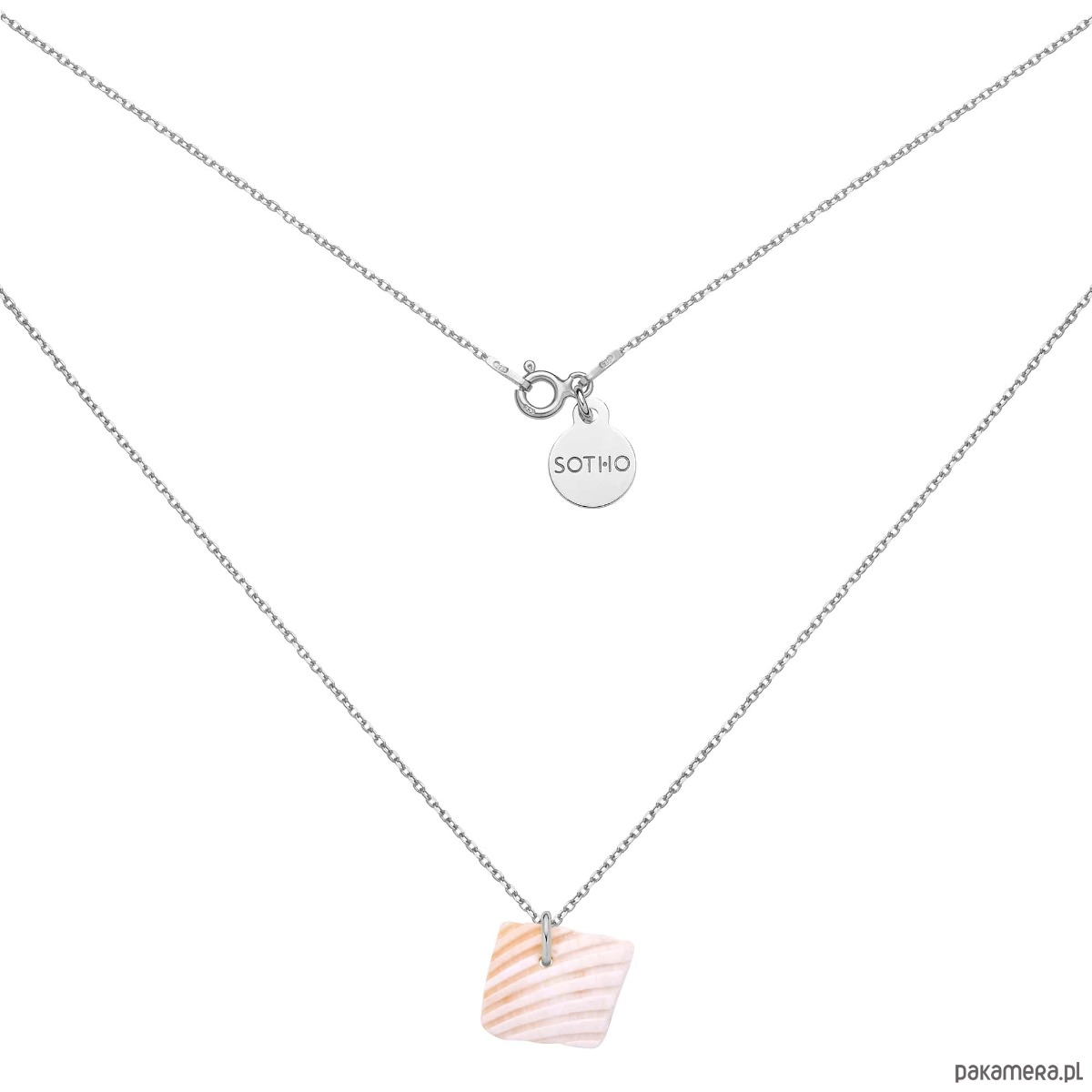 Srebrny naszyjnik łańcuszkowy z muszelką i zawieszką z logo marki. Każdy egzemplarz posiada unikatową, niepowtarzalną muszelkę. Całość wykonana ze srebra 925.