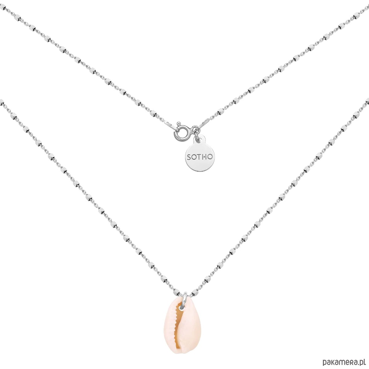 Srebrny naszyjnik kosteczkowy zdobiony muszelką i zawieszką z logo marki. Całość wykonana ze srebra 925.