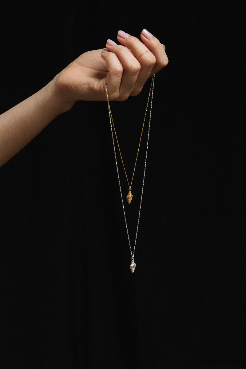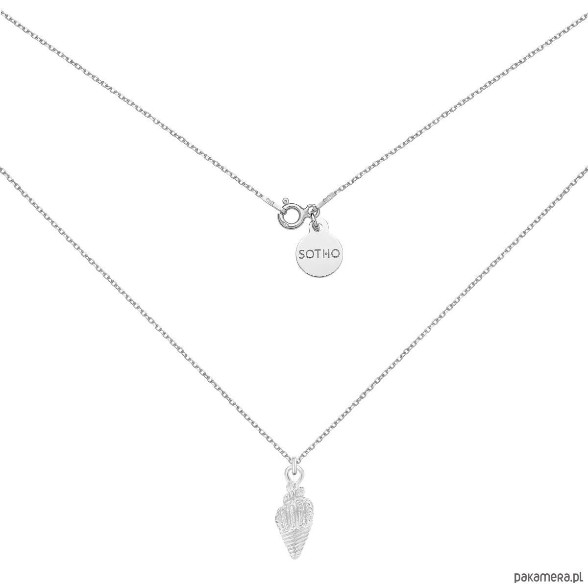 Srebrny naszyjnik z muszelką. Całość wykonana ze srebra 925.