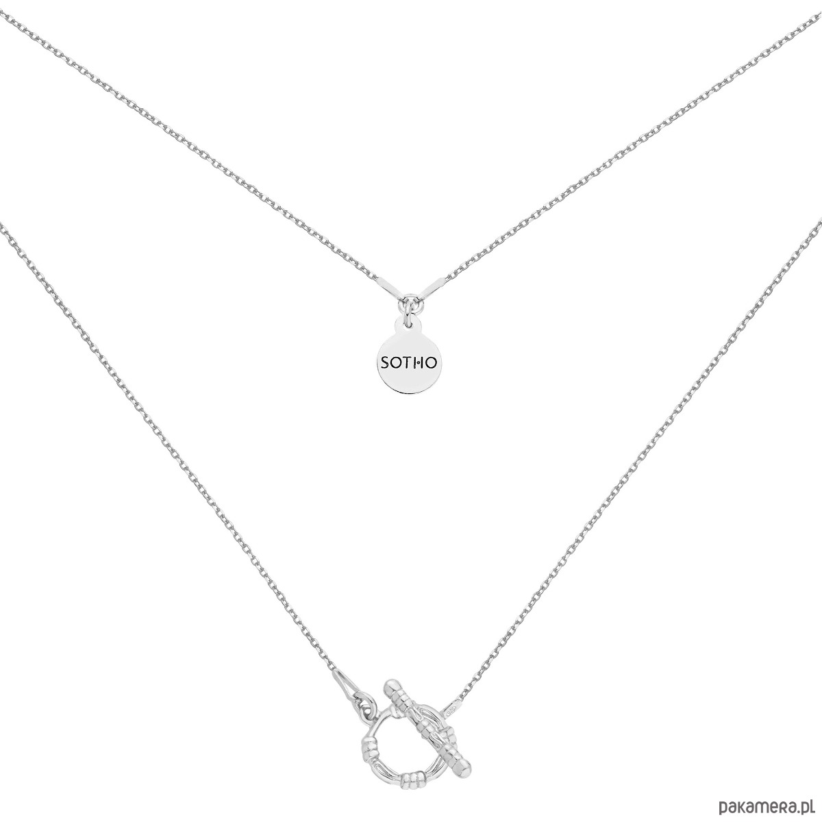 Srebrny naszyjnik z ozdobnym zapięciem i zawieszką z logo marki. Całość wykonana ze srebra 925.