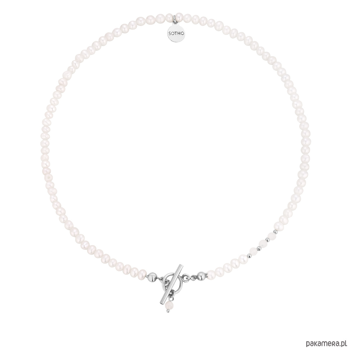 Srebrny naszyjnik wykonany z naturalnych pereł słodkowodnych, fasetowanego kamienia księżycowego, srebrnych kuleczek i zawieszką z logo marki. Wszystkie elementy wykonane ze srebra 925.
