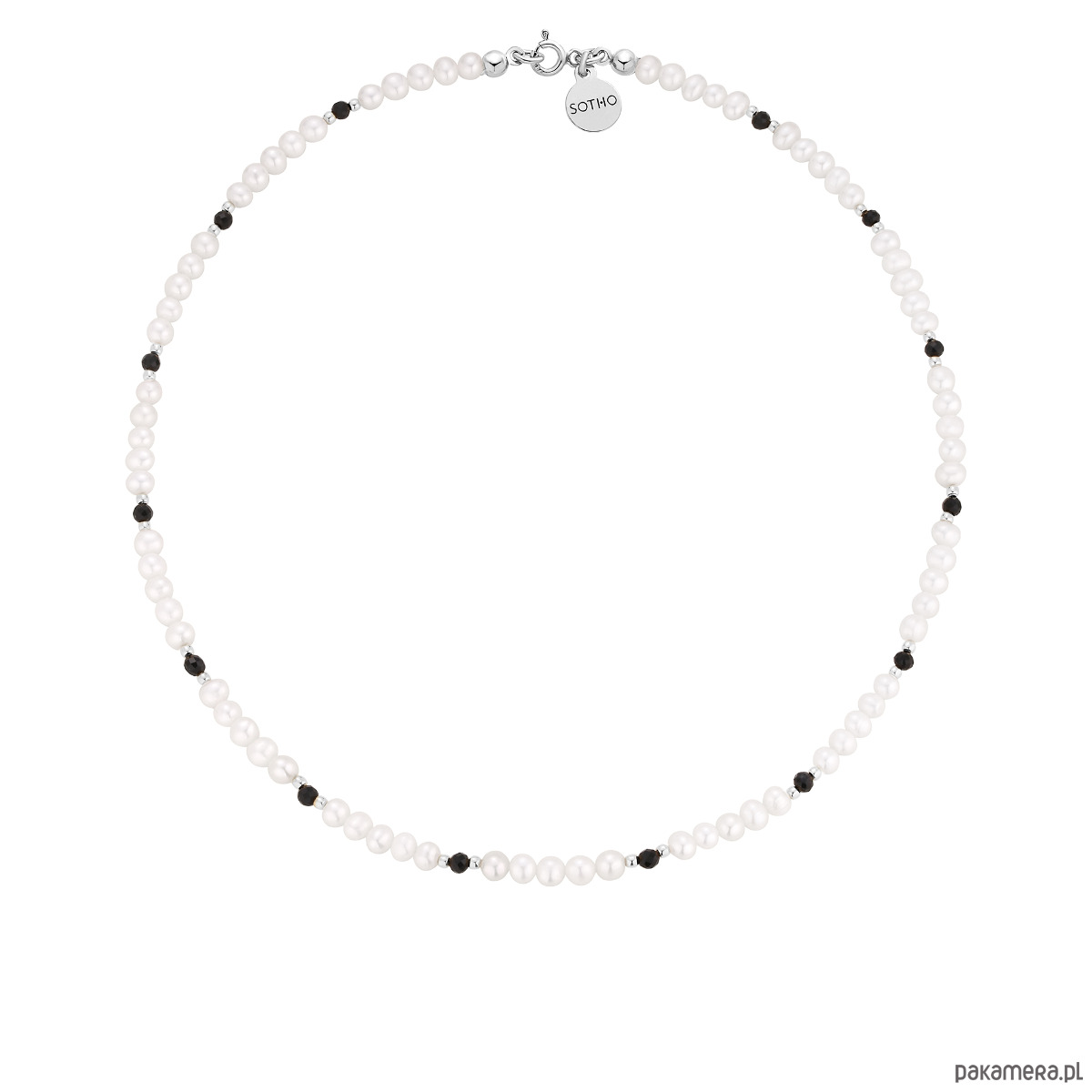Srebrny naszyjnik wykonany z naturalnych pereł słodkowodnych, fasetowanego onyksu, srebrnych kuleczek i zawieszki z logo marki. Wszystkie elementy wykonane ze srebra 925.