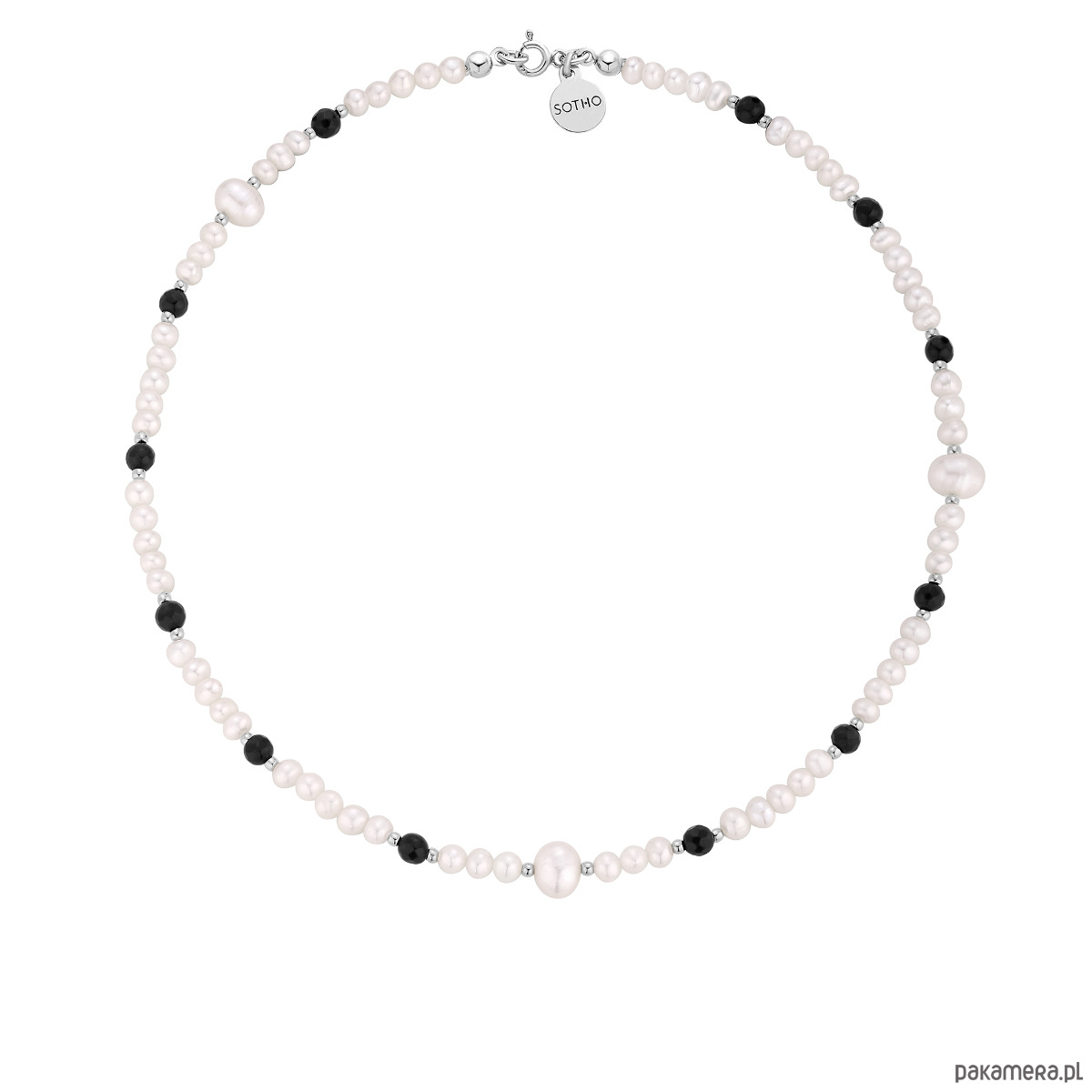 Srebrny naszyjnik wykonany z naturalnych pereł słodkowodnych, onyksu, złotych kuleczek i zawieszki z logo marki. Wszystkie elementy wykonane ze srebra 925.