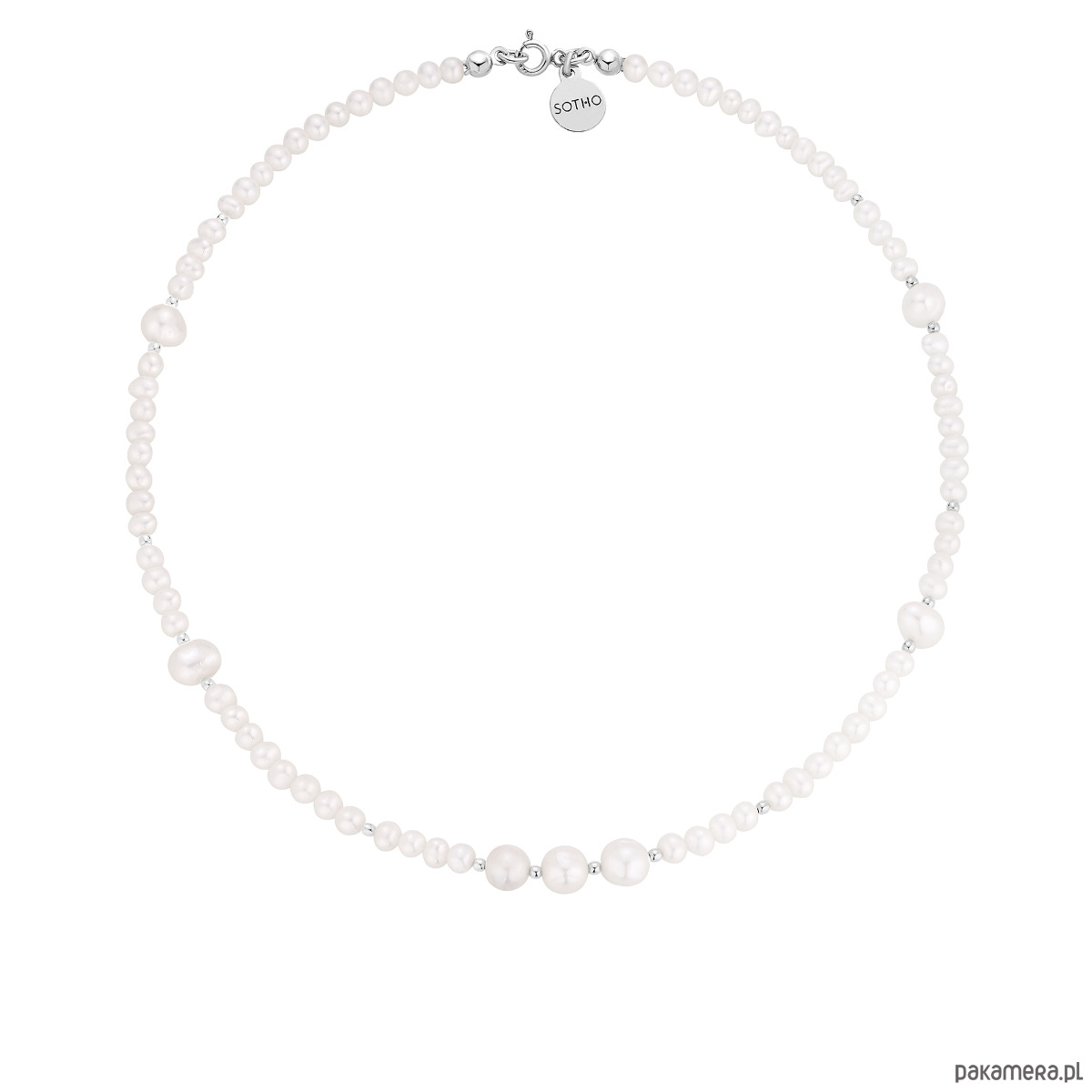 Srebrny naszyjnik wykonany z naturalnych pereł słodkowodnych, zdobiony srebrnymi kuleczkami i zawieszką z logo marki. Wszystkie elementy wykonane ze srebra 925.