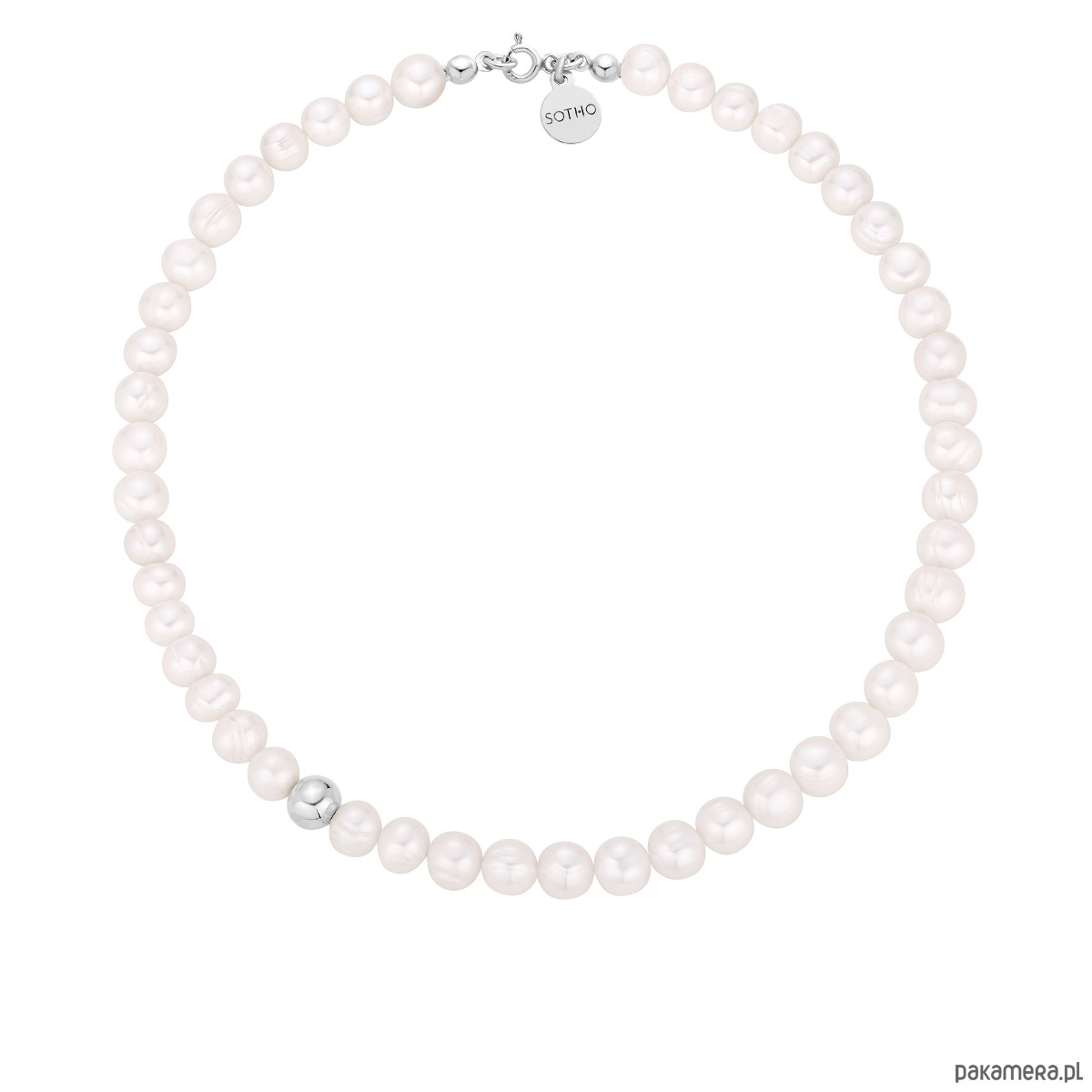 Srebrny naszyjnik wykonany z naturalnych pereł słodkowodnych z kulką i zawieszką z logo marki. Wszystkie elementy wykonane ze srebra 925.