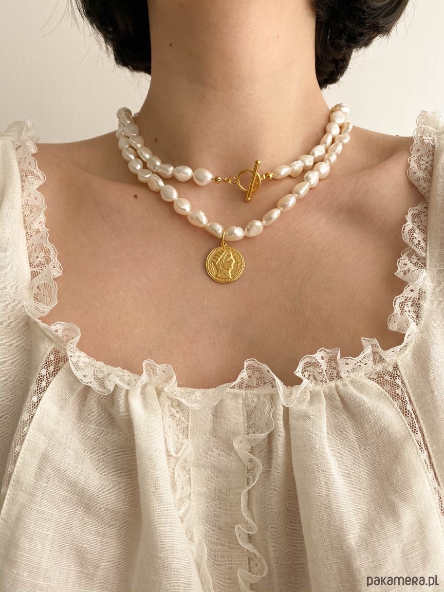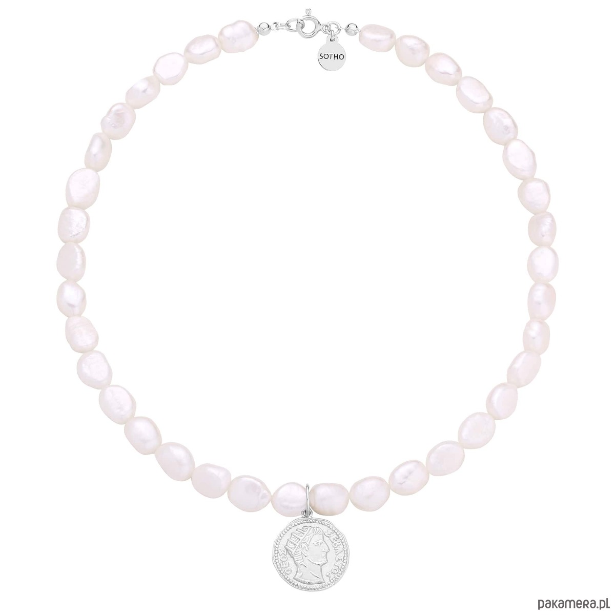 Srebrny naszyjnik z monetą wykonany z naturalnych pereł słodkowodnych, zdobiony zapięciem i logo marki. Wszystkie elementy wykonane ze srebra 925. Perły są nieregularne, unikatowe, delikatnie różnią się od siebie i mogą różnić się od tych na zdjęciu.