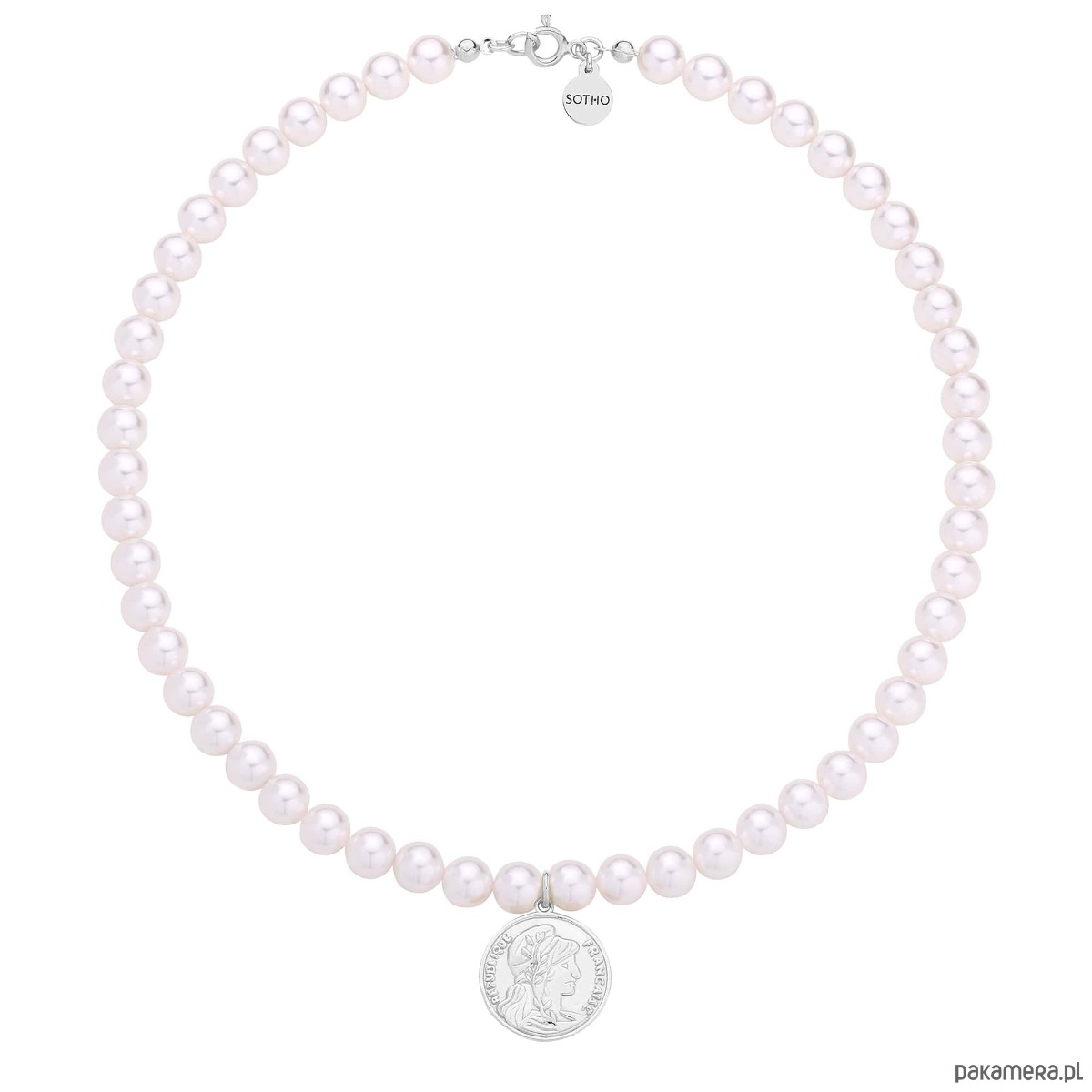 Srebrny naszyjnik z monetą wykonany z pereł SWAROVSKI® CRYSTAL w kolorze białym White. Wszystkie elementy wykonane ze srebra 925.