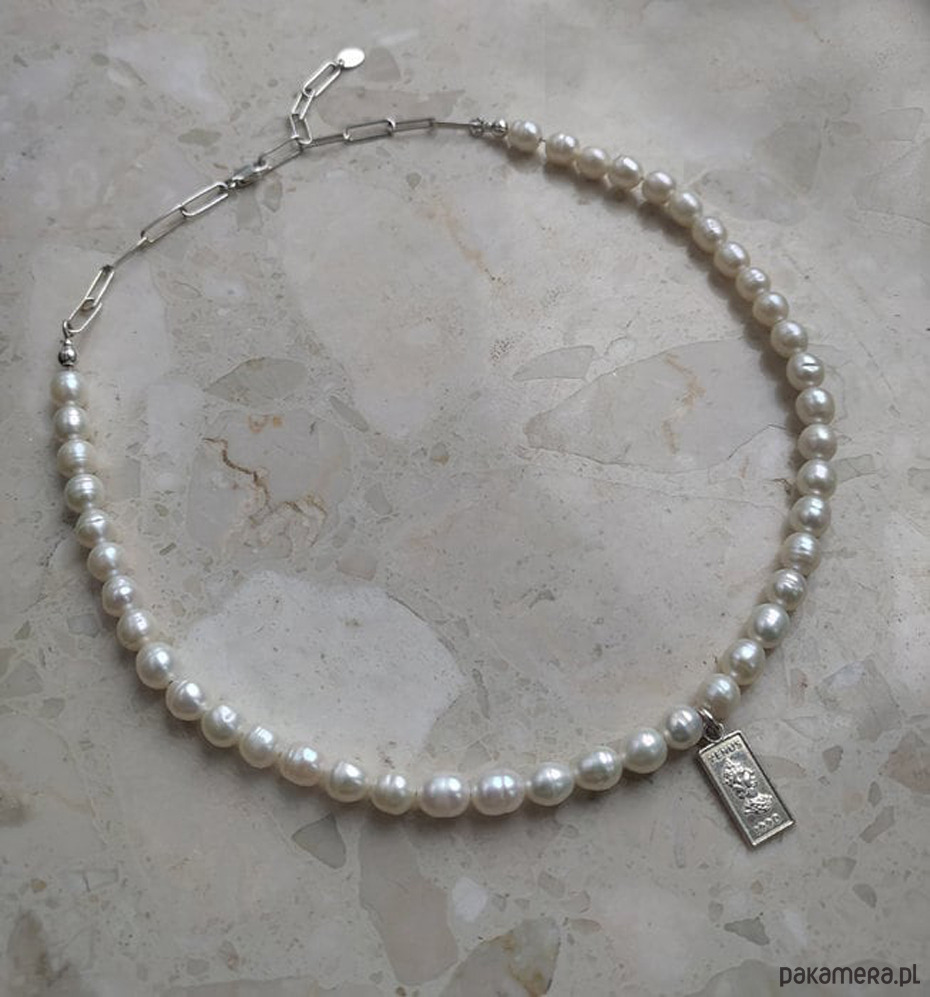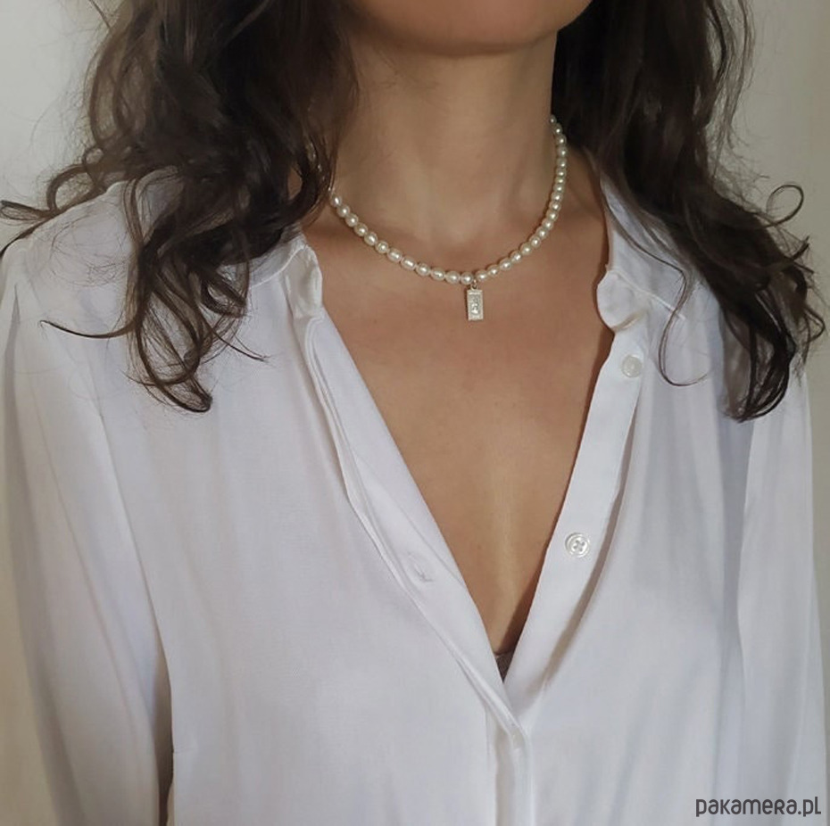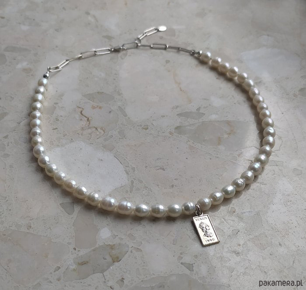 Naszyjnik wykonany jest ze srebra pr 925 i naturalnych prawdziwych pereł w kolorze białym.