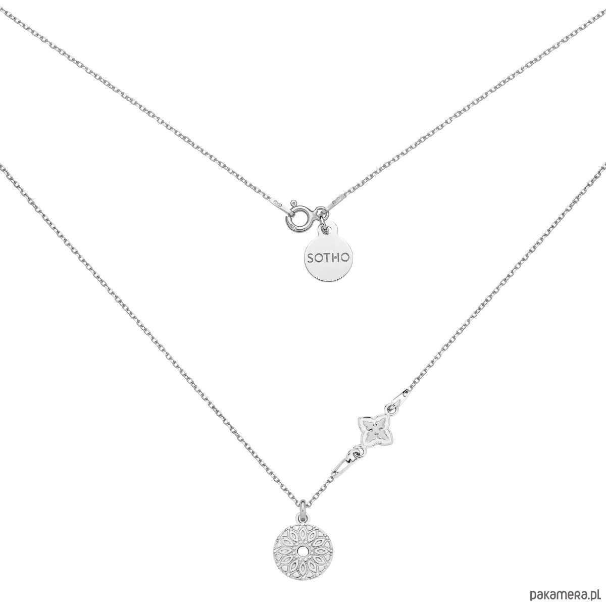 Srebrny naszyjnik łańcuszkowy z rozetką i medalionem z zawieszką z logo marki. Całość wykonana ze srebra 925.