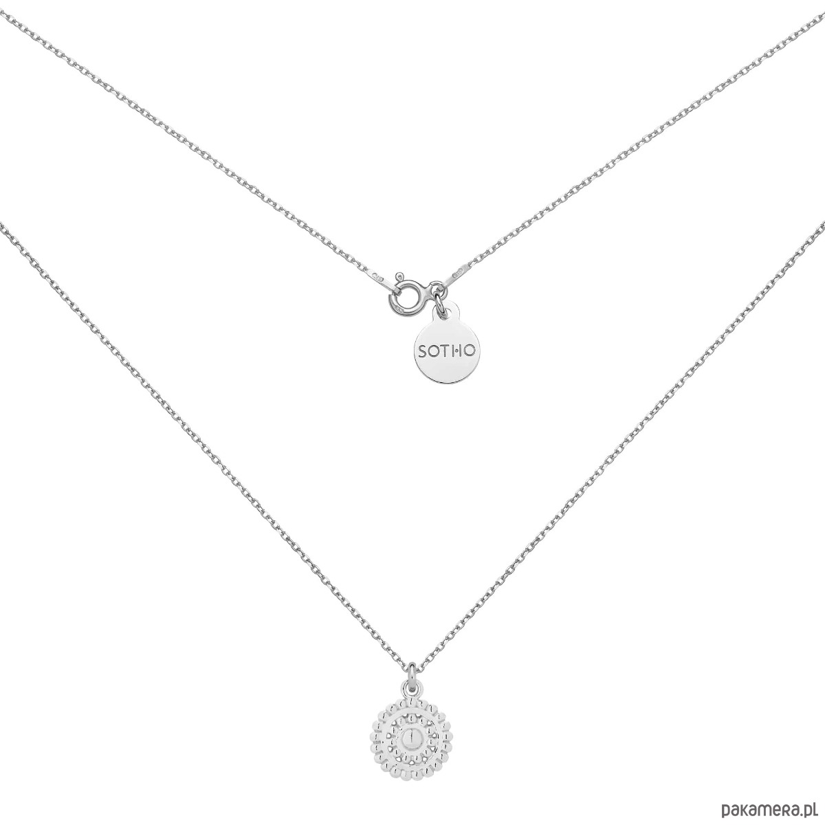 Srebrny naszyjnik łańcuszkowy zdobiony rozetką i zawieszką z logo marki. Całość wykonana ze srebra 925.