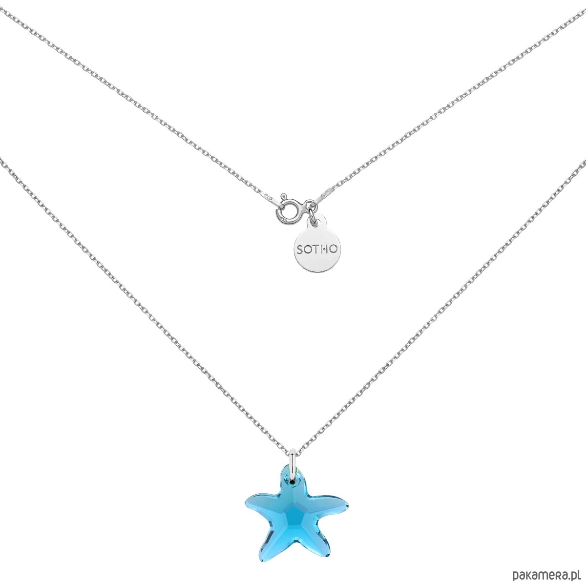 Srebrny naszyjnik łańcuszkowy zdobiony kryształową rozgwiazdą SWAROVSKI® CRYSTAL w kolorze Indicolite i zawieszką z logo marki. Całość wykonana ze srebra 925.
