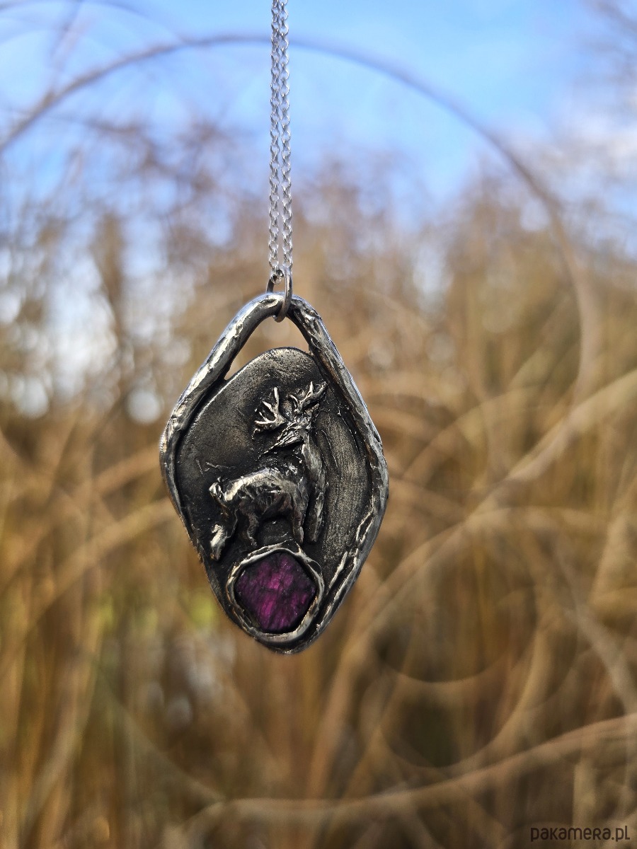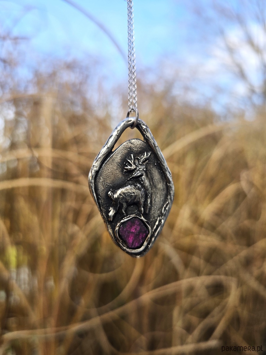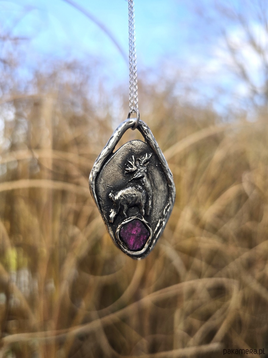 Użyte materiały: srebro najwyższej próby 999, rubin 10x9mm