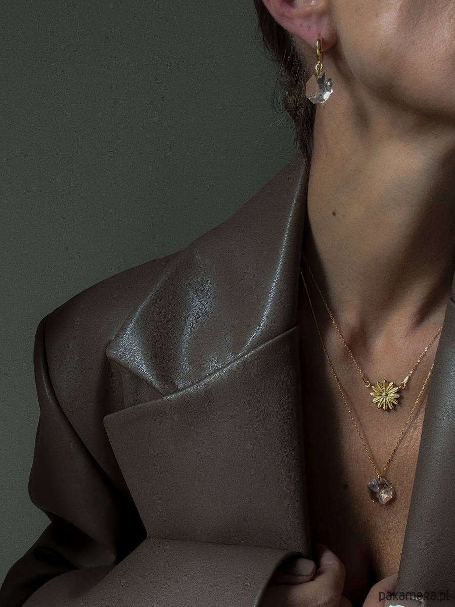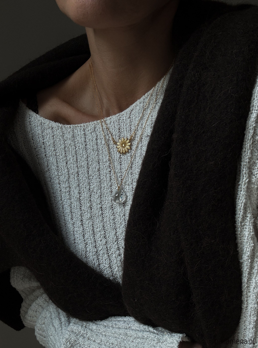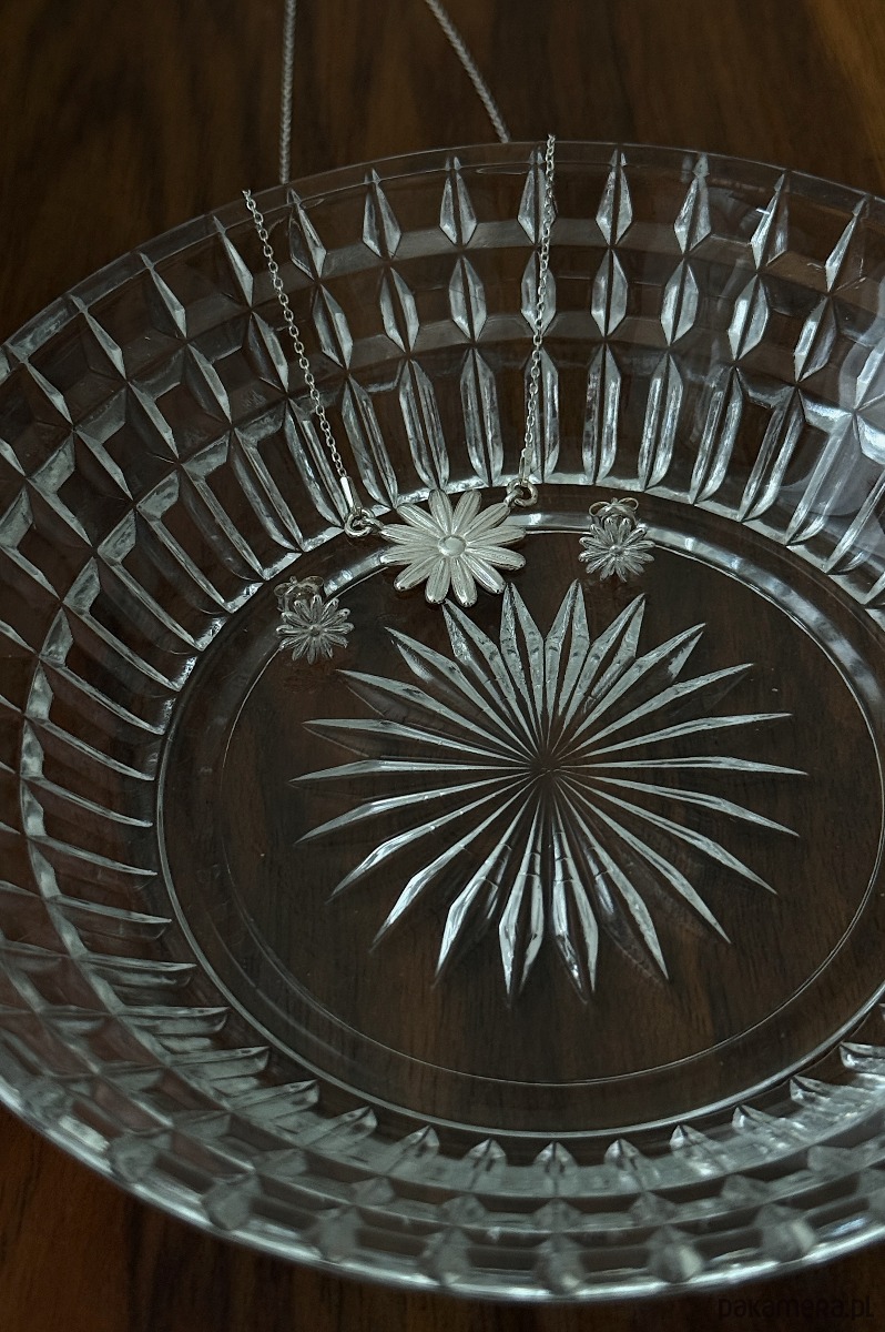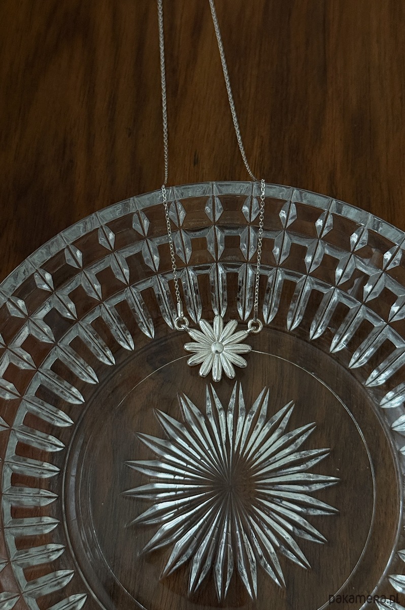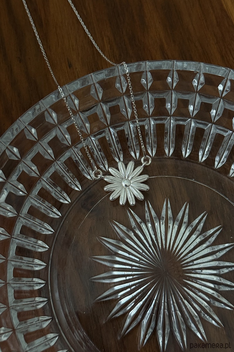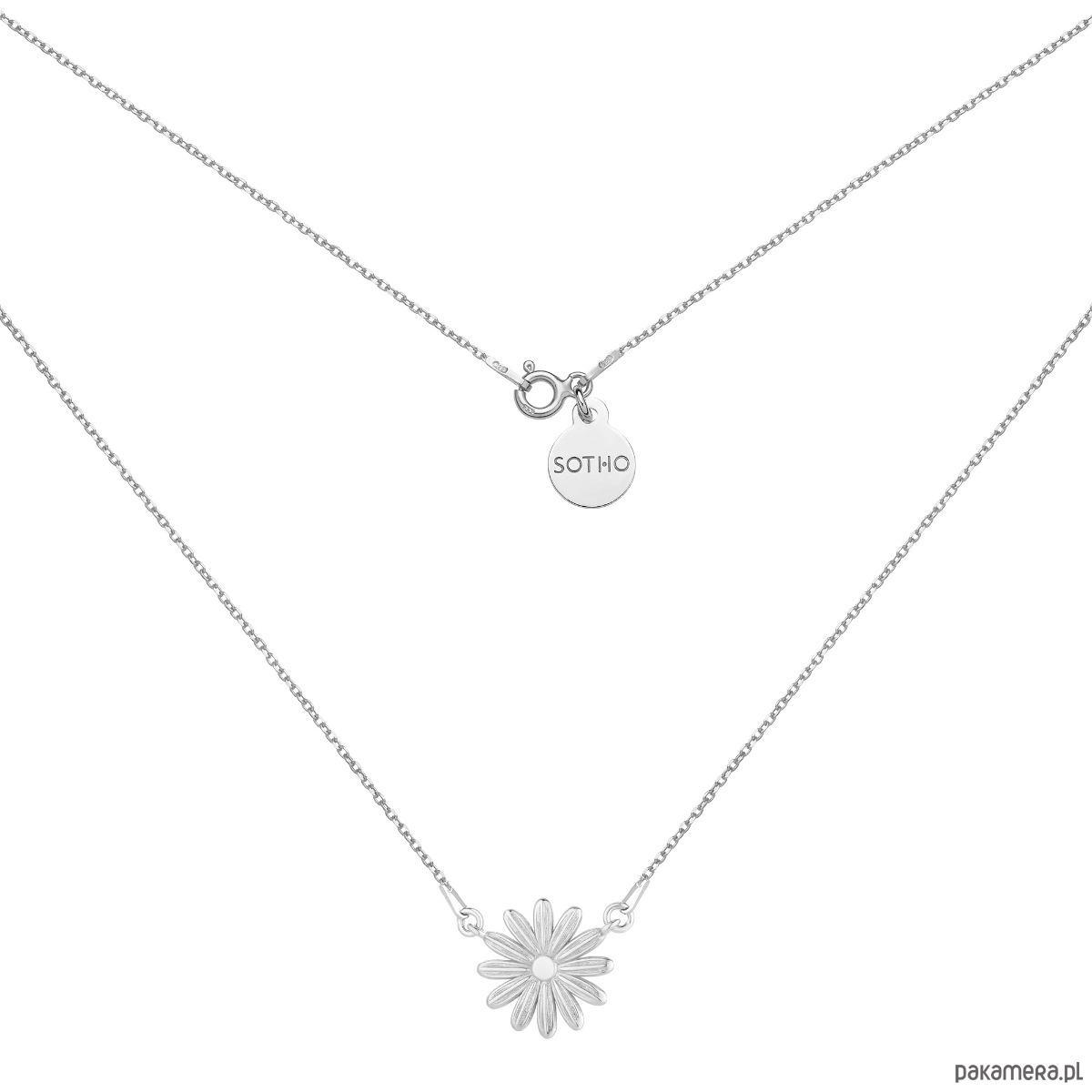 Srebrny naszyjnik z stokrotką i zawieszką z logo marki. Wszystkie elementy wykonane ze srebra 925.