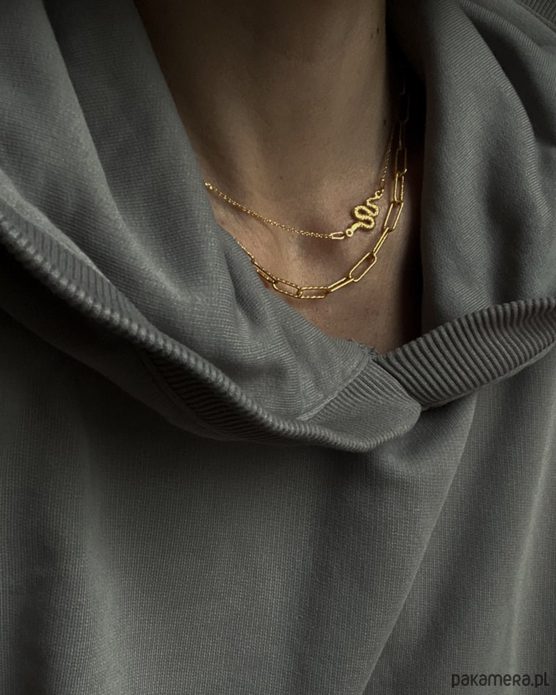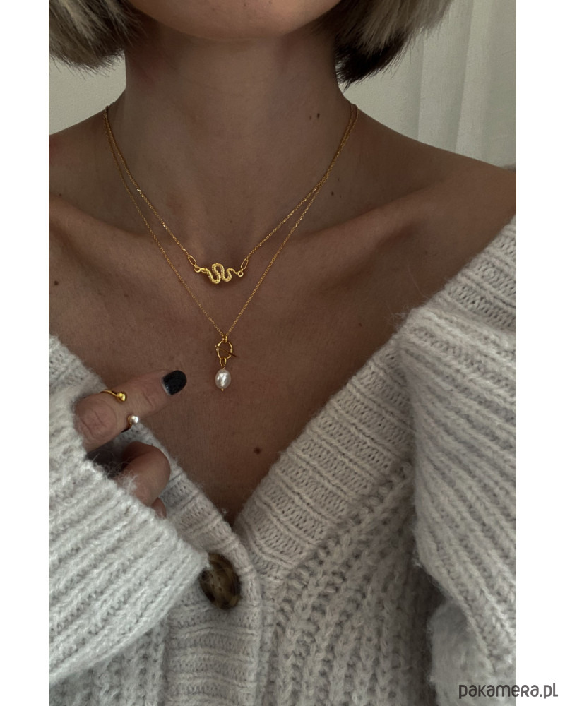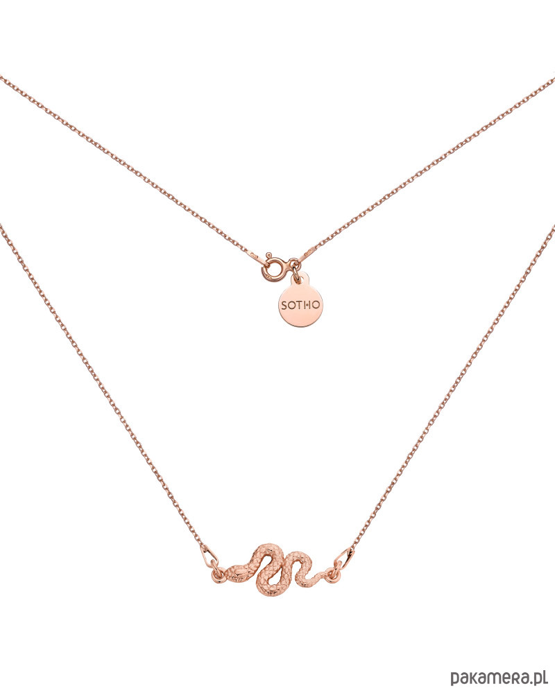 Złoty naszyjnik z wężem i zawieszką z logo marki. Całość wykonana ze srebra 925 powlekanego 24 karatowym różowym złotem.